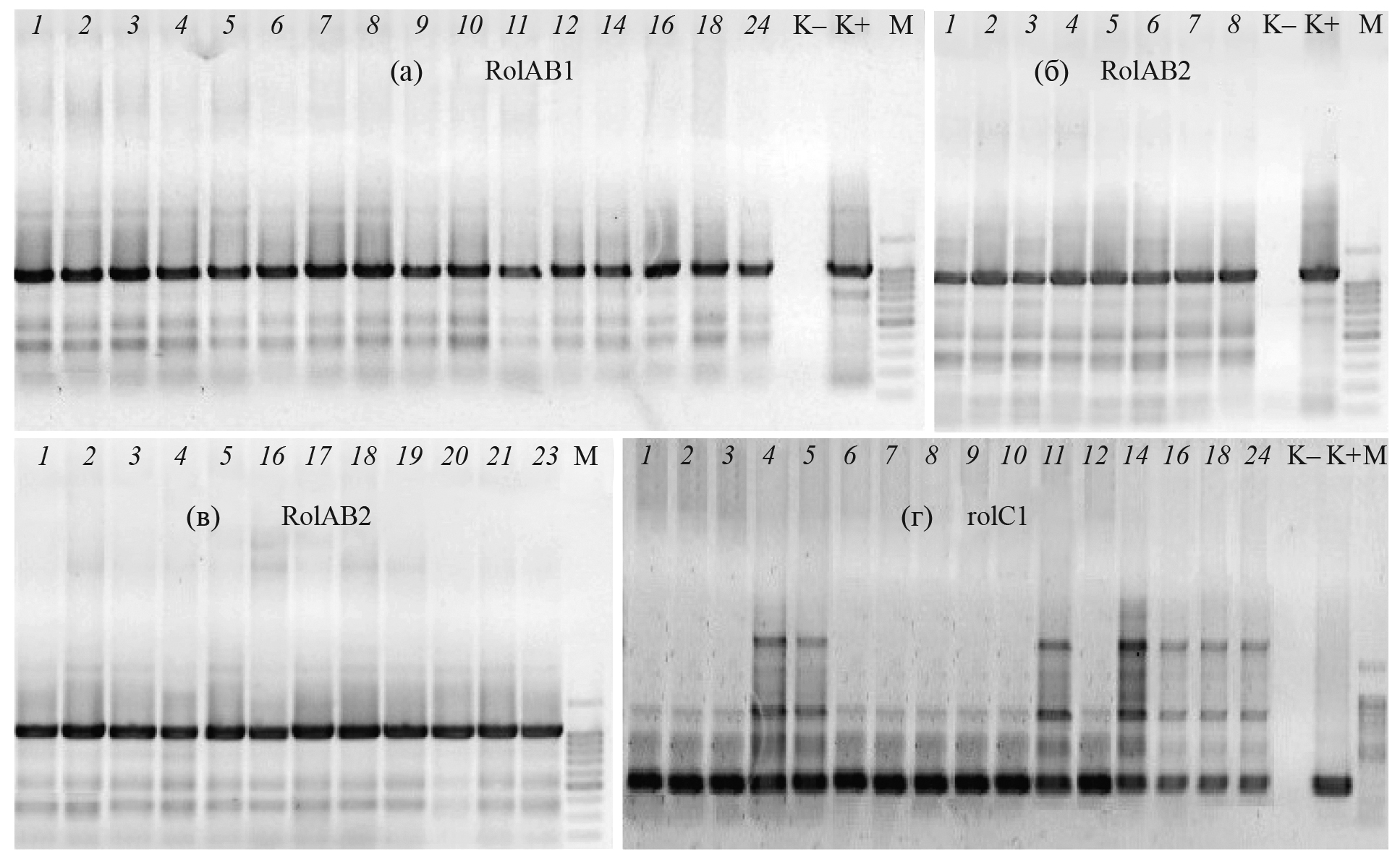 Рис. 3. Электрофореграмма результатов ПЦР-анализа побегов-регенерантов с праймерами RolAB1, RolAB2 и rolC1: (а), (г) – К599, (б) – 15834, (в) – А4. М – маркер длин ДНК 1kb DNA Ladder. К – отрицательный контроль ПЦР. К+ – положительный контроль ПЦР. Размеры ПЦР-продуктов: 1112 п.н. (RolAB1), 1127 п.н. (RolAB2), 267 п.н. (rolC1).
