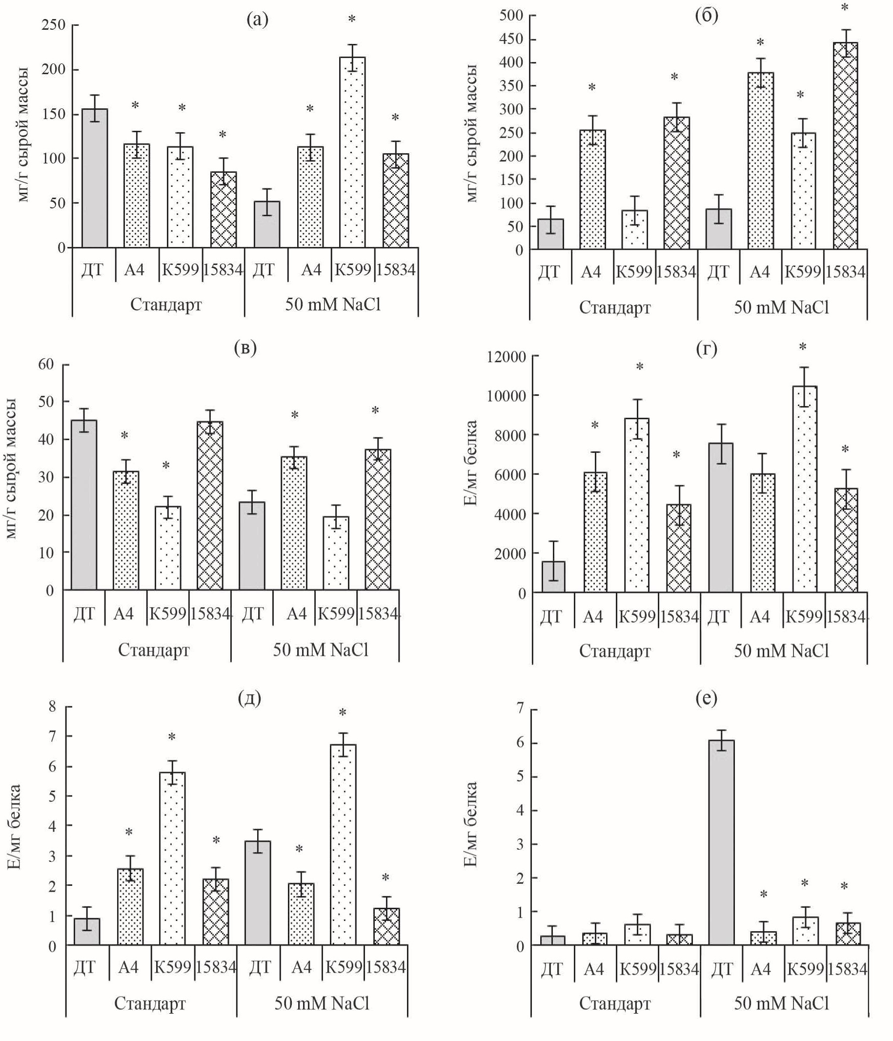 Рис. 5. Анализ антиоксидантной системы и определение общего растворимого белка табака ДТ и трансгенных растений в нормальных условиях и при засолении в концентрации 50 мМ NaCl: (а) – содержание водорастворимых сахаров, (б) – содержание пролина, (в) – содержание общего растворимого белка, (г) – активность каталазы, (д) – активность гваяколпероксидазы, (е) – активность аскорбатпероксидазы. Звездочками (*) обозначены достоверно различающиеся результаты между ДТ и трансгенными растениями (P ≤ 0.05).