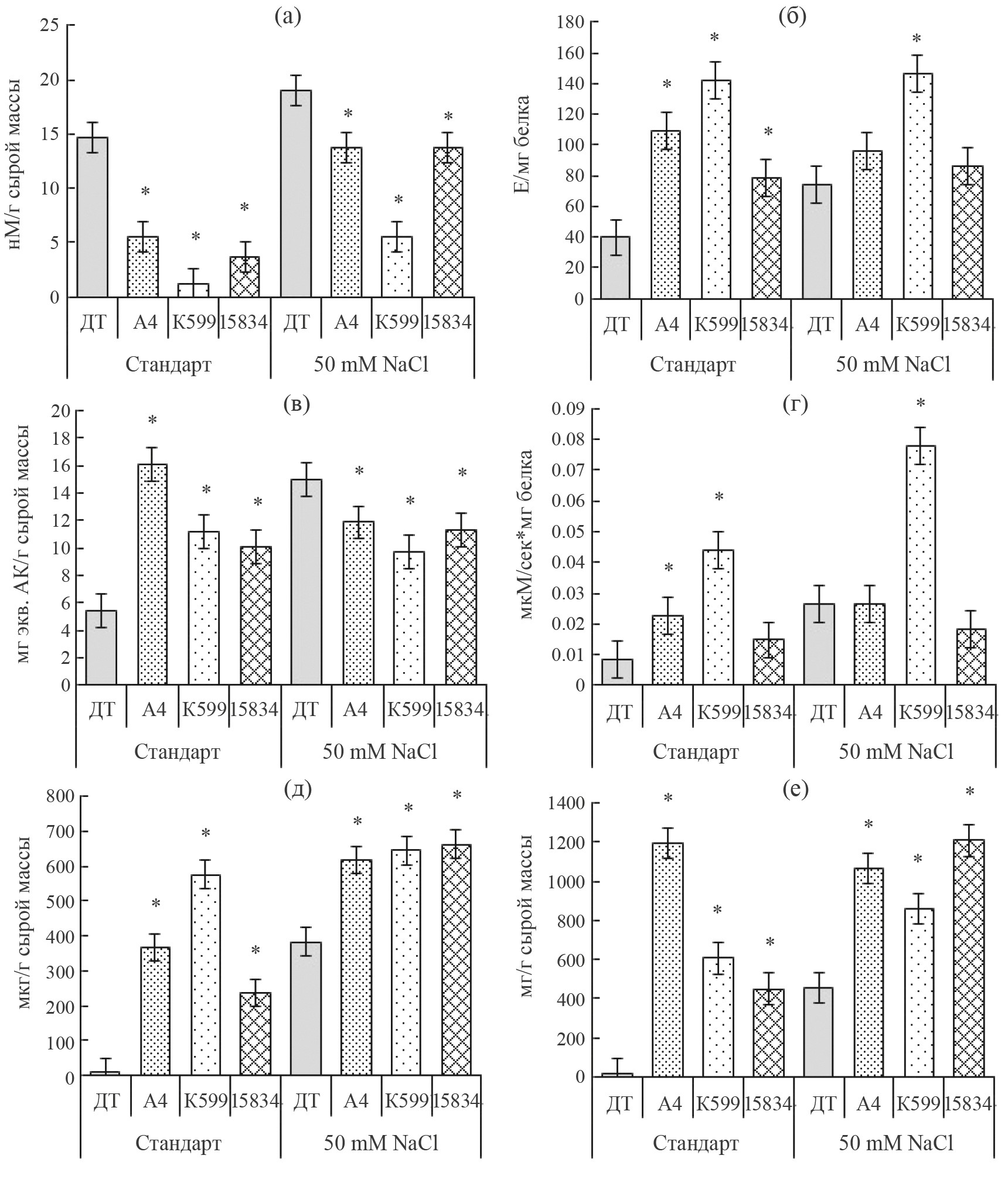 Количество восстановленного глутатиона (GSH) (рис. 6д) при нормальных условиях было выше в среднем в 41 раз в корнях растений А4, в 26.8 раза – 15834, в 65.5 раза – К599 по сравнению с ДТ. При засолении содержание GSH в корнях растений ДТ увеличилось в 43.6 раза, а в трансгенных растениях А4 в среднем в 1.7 раза, 15834 – в 2.8 раза, К599 – в 1.2 раза. Таким образом, в корнях всех трансгенных растений с rol-генами при засолении было больше GSH, чем у ДТ.