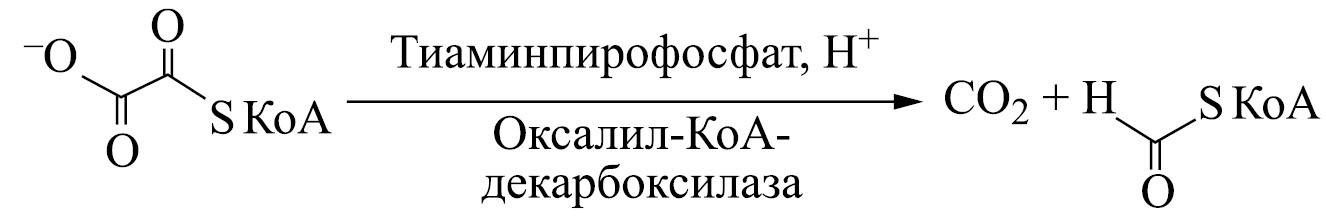 Третий путь превращения кислоты – многоэтапный процесс с первоначальной активацией ЩК кофермент А(КоА)-трансферазой до оксалил-КoА (рис. 1). Подробные исследования свойств Pseudomonas oxalaticus, Bacillus halophilus и Oxalobacter formigenes позволили сделать вывод, что деградация оксалатов бактериями в основном опосредована тиаминзависимым ферментом оксалил-КоА-декарбоксилазой [74].