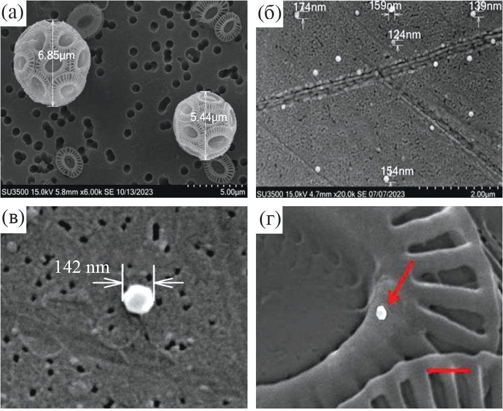 Для регистрации вирусов и их воздействия на клетки водорослей использовали сканирующий электронный микроскоп Hitachi SU3500 (Hitachi, Япония). С этой целью экспериментальные пробы объемом 2 мл, содержащие клетки E. huxleyi и вирусные частицы, фильтровали через трековую мембрану с диаметром пор 0.4 мкм (РЕАТРЕК-Фильтр, Россия). Чистую вирусную суспензию пропускали через трековую мембрану с диаметром пор 0.03 мкм. Затем образцы обезвоживали с помощью этилового спирта различной концентрации: 20, 30, 50, 75, 96 и 100% [24] и сушили в критической точке (1.5–2.5 ч) с использованием установки Leica EM CPD300 (Leica microsystems, Германия). Для напыления металлов (Au/Pd; 0.5–1.0 мин) применяли прибор Leica EM ACE200 (Leica microsystems, Германия).