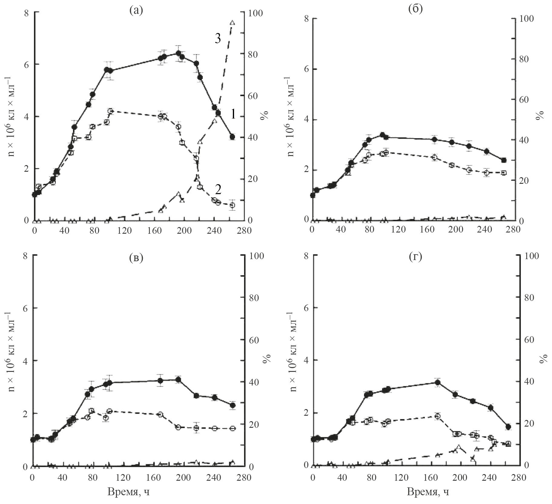 Рис. 2. Динамика численности клеток Emiliania huxleyi под влиянием вирусной инфекции: 1 – неинфицированные клетки; 2 – инфицированные клетки; 3 – “голые” клетки; а – полная среда f/2; б – среда без азота; в – среда без фосфора; г – морская вода без биогенных элементов.