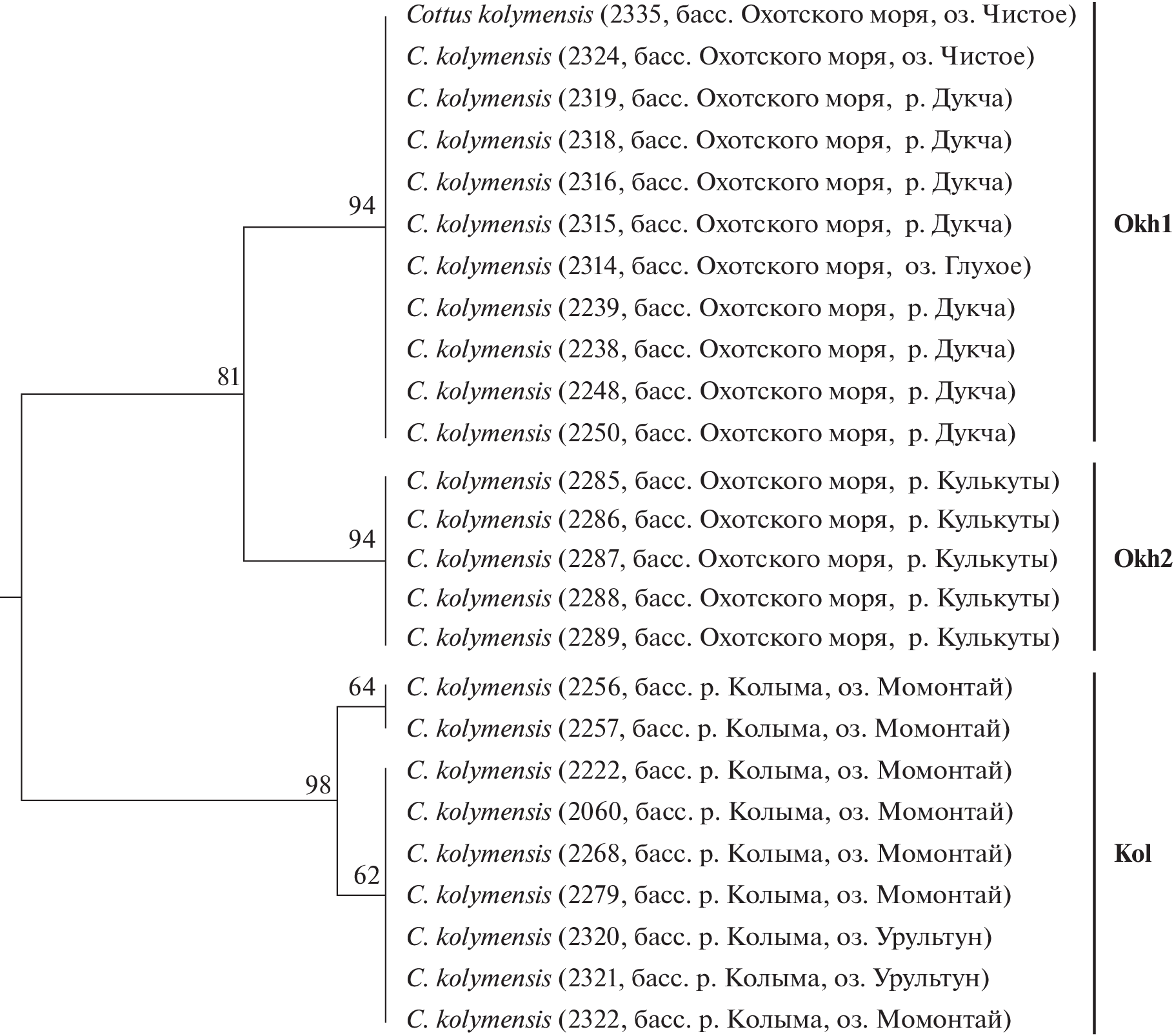 For the first time, a karyological and molecular genetic (COI, cytochrome b, 16S rRNA genes) study of the freshwater fish species Cottus kolymensis, recently described from the Dukcha and Kolyma rivers in northeast Asia, was carried out. A complex of karyological and molecular-genetic marker traits has been determined to identify the species. Genetic differences between the populations of C. kolymensis inhabiting the water bodies of the river basins of Kolyma and the northern part of the Sea of Okhotsk were found. On their basis the species is divided into groups in accordance with the habitat. The existence of a separate group “Cottus poecilopus” within the genus Cottus, which includes taxa of the species rank, including C. kolymensis, has been confirmed.