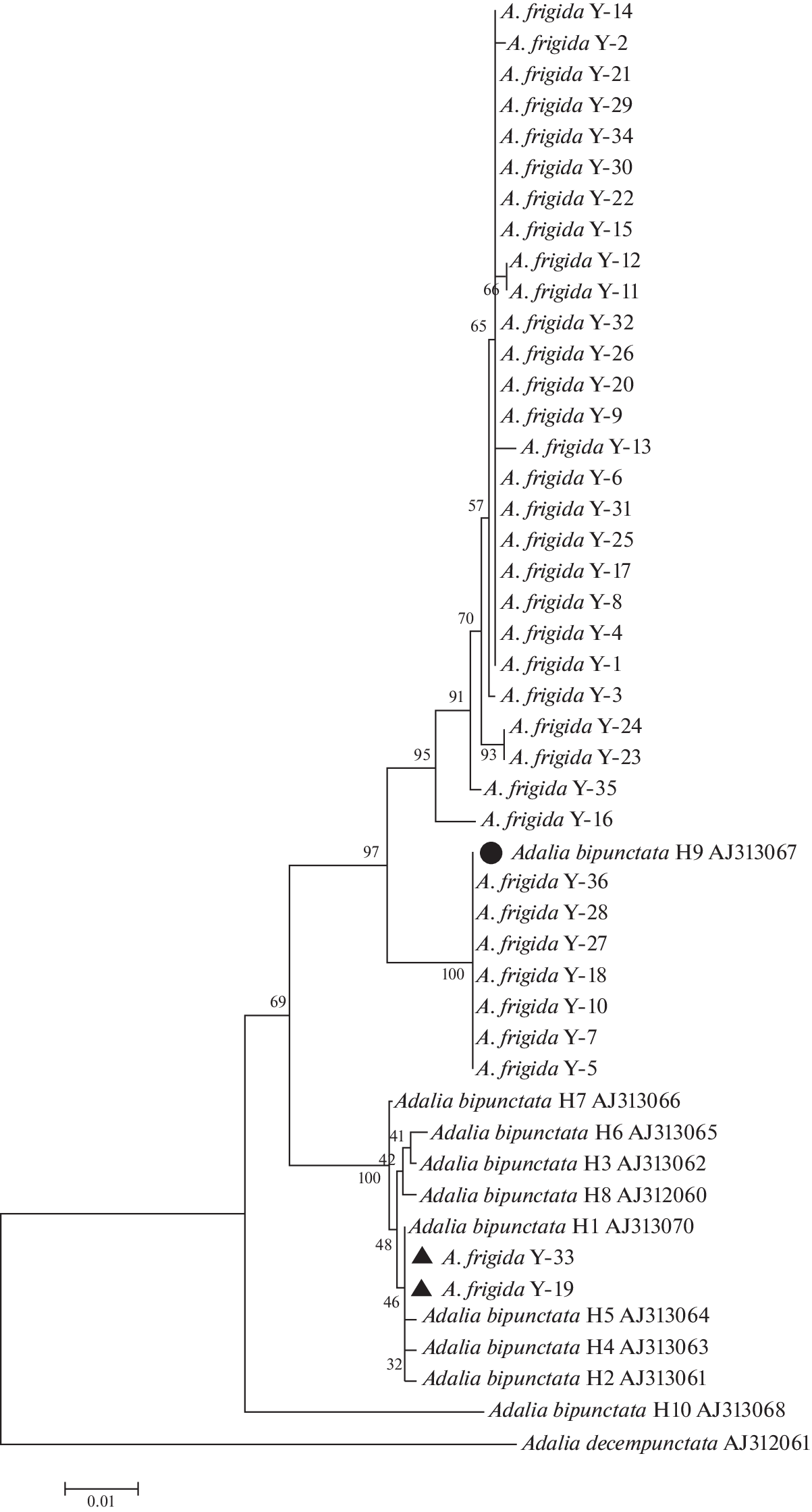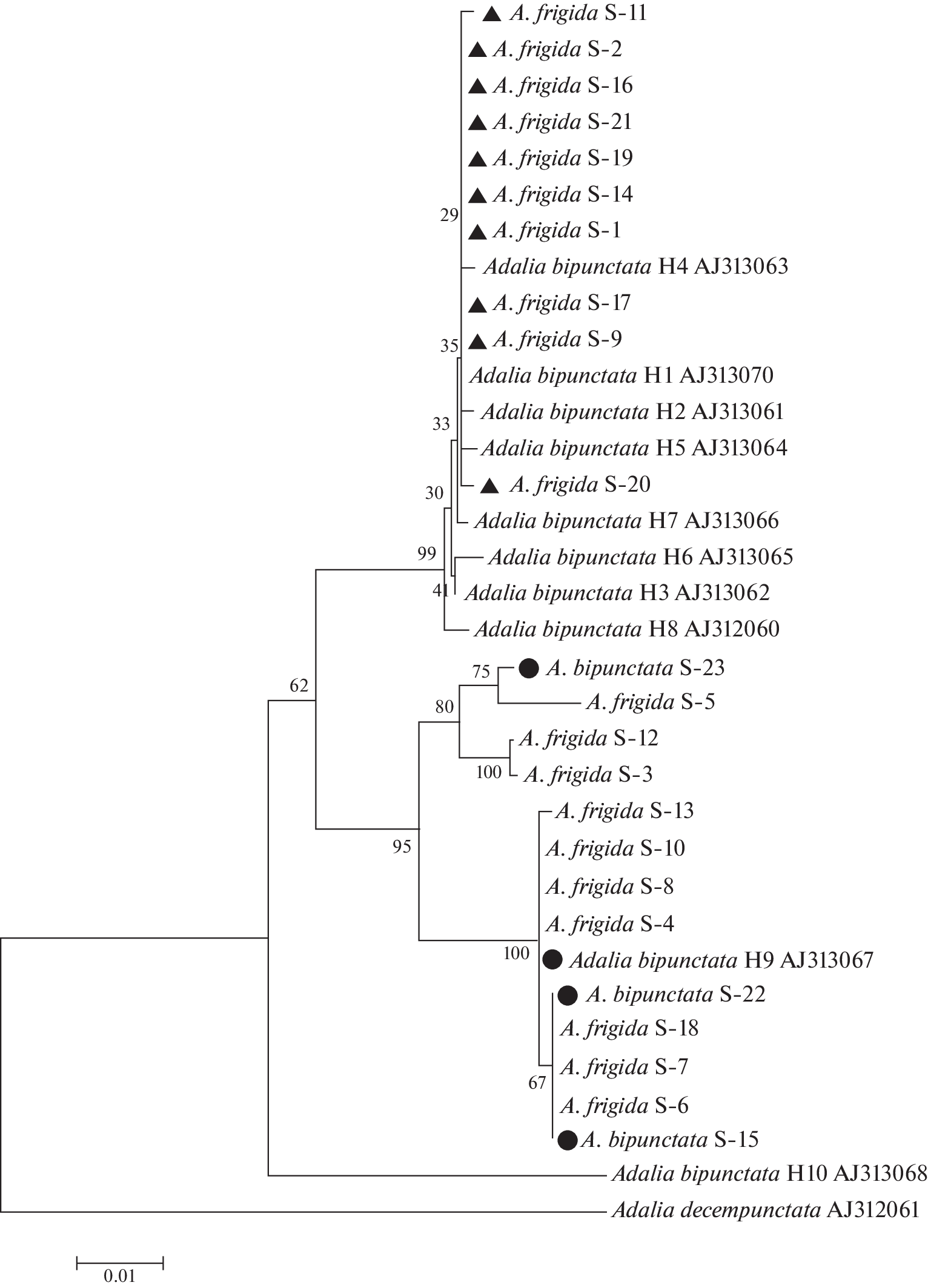Genetic Introgression in Populations of Two Related Species Adalia frigida (Schneider, 1792) and Adalia bipunctata (Linnaeus, 1758) (Coleoptera: Coccinellidae) in the Zone of Sympatry