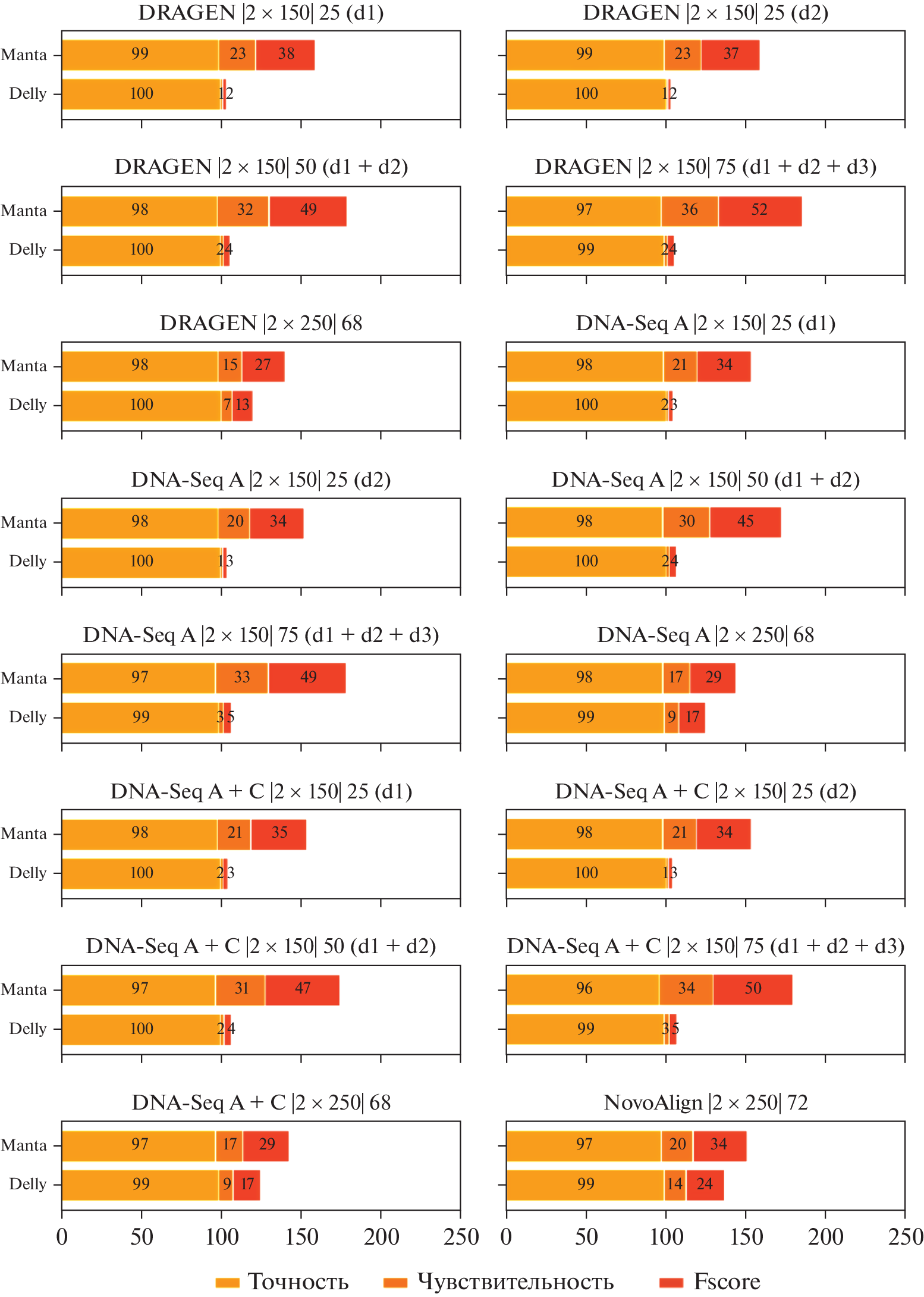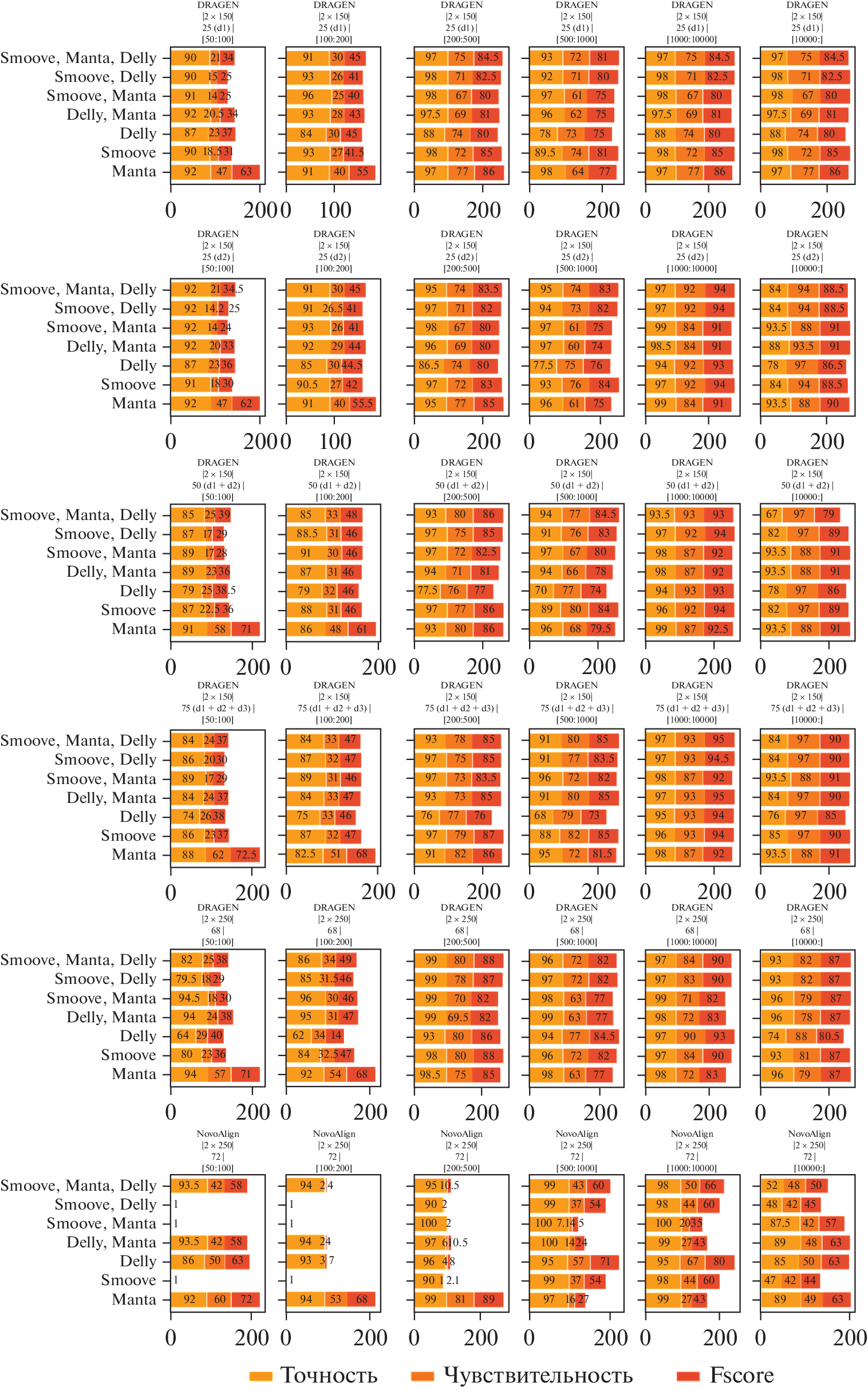 In this study three structural variant callers (Manta, Smoove, Delly) were analysed on the whole-genome sequencing data using four different alignment algorithms: DRAGEN, GDC DNA-Seq Alignment Workflow, GDC DNA-Seq Alignment Workflow + GDC DNA-Seq Co-Cleaning Workflow, NovoAlign, different lengths of raw reads: 2 × 150 bp and 2 × 250 bp, different mean genome coverage values. Results were compared to etalon results of GIAB team. Structural variants validation was hold also with Sanger sequencing. Structural variants deletions and insertions as it turned out were best determined with Manta tool. We’ve got 89–96% of accuracy and 59–70% of sensitivity for analysed deletions, and also 96–99% of accuracy and 15–36% of sensitivity for insertions. Smoove and Delly showed less accurate and sensitive results (Smoove: 91–95% of accuracy and 8–54% of sensitivity for deletions, Delly: 78–87% of accuracy and 31–66% of sensitivity for deletions, 99–100% of accuracy and 1–13% of sensitivity for insertions). Simultaneous using of two or even three structural variant callers didn’t give a rise of accuracy and sensitivity for deletions. Analysis showed that accuracy and sensitivity of structural variant callers rise with the rising of mean genome coverage value, increasing of reads length from 150 to 250 bp influence in to varying degrees on the accuracy and sensitivity of individual tools. Another inference of this study was that accuracy of structural variants callers vary depends on structural variants size range. For example, Manta finds better deletions in the range from 200 and more bp, Delly – from 1000 to 10 000 bp, Smoove – from 200 to 10 000 bp.