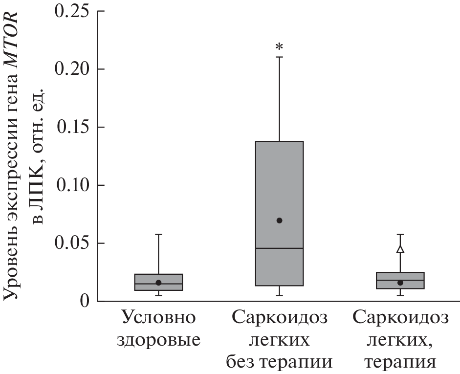 The aim of the study was to study the association of polymorphic variants rs2295080 and rs1883965 of the MTOR gene with the risk of developing pulmonary sarcoidosis. The study included 253 people (122 patients diagnosed with morphologically verified sarcoidosis with lung involvement (average age – 41.00 ± 12.56 years) and 131 healthy people (control group) (average age – 44.00 ± 14.23). The distribution of alleles and genotypes of polymorphic markers rs2295080 and rs1883965 of the MTOR gene was analyzed in the study groups. There was a statistically significant increase in the level of mRNA expression of the MTOR gene in PBL of patients with pulmonary sarcoidosis compared with the control group (p = 0.007). A decrease in the number of transcripts of this gene was noted in patients receiving therapy compared with patients without therapy (p = = 0.025). There were no statistically significant differences in the distribution of allele and genotype frequencies for polymorphic markers rs2295080 and rs1883965 of the MTOR gene in the group of patients with pulmonary sarcoidosis and in the control group: (χ2 = 0.196, d.f. = 1, p = 0.658 and χ2 = 0.637, d.f. = 2, p = = 0.728) and (χ2 = 0.034, d.f. = 1, p = 0.855 and χ2 = 0.051, d.f. = 2, p = 0.975) respectively. Conclusion: аn increased level of expression of the MTOR gene in peripheral blood leukocytes of patients with pulmonary sarcoidosis may indicate the involvement of this gene in the pathogenesis of this disease. Polymorphic markers rs2295080 and rs1883965 of the MTOR gene are not associated with the risk of developing pulmonary sarcoidosis. Probably, an increase in the expression level of the MTOR gene in patients with pulmonary sarcoidosis is due to the development of inflammation.