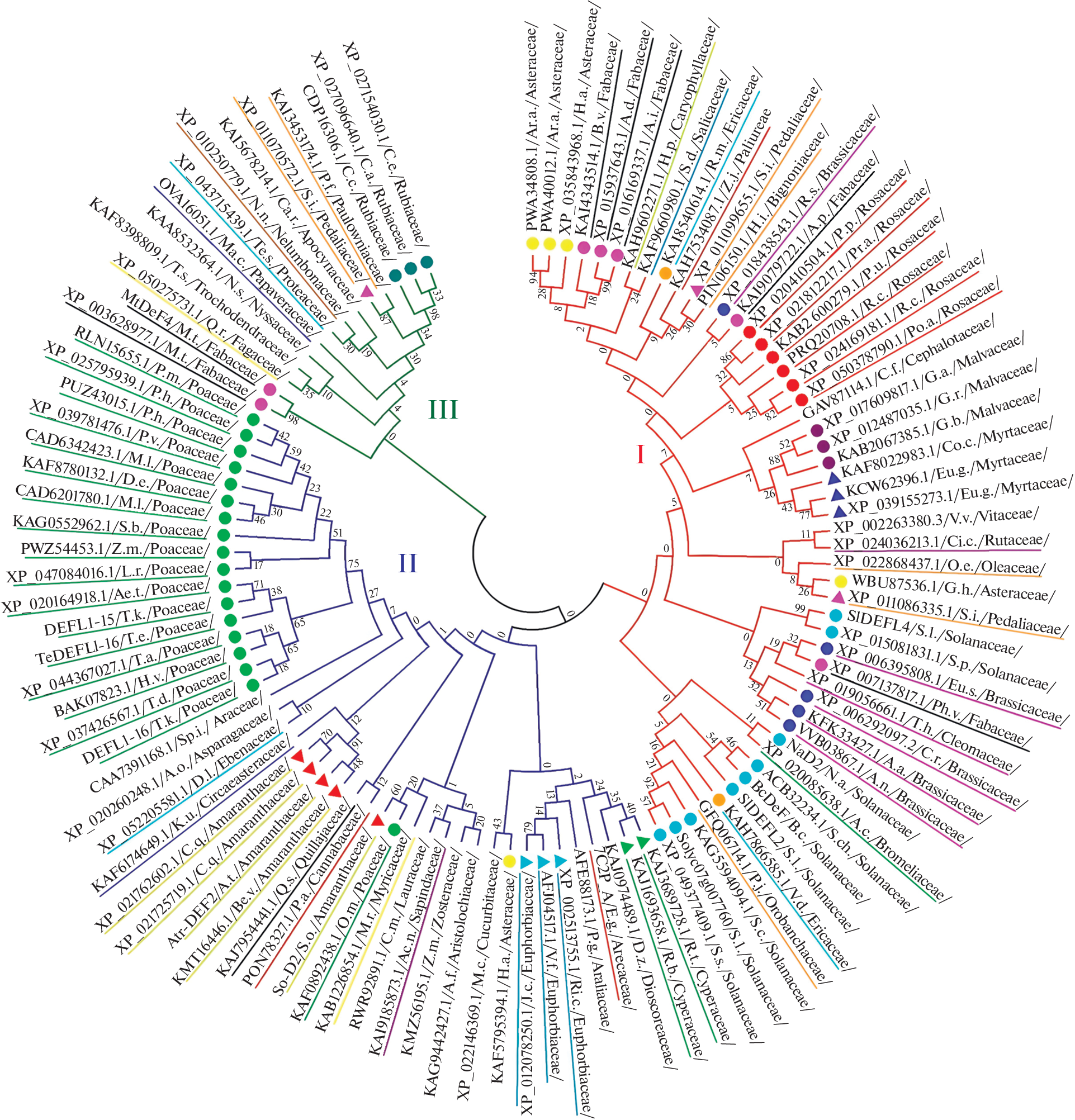 Antimicrobial peptides (AMPs) are major components of innate immunity in plants and animals. AMP genes have significant intra- and interspecific polymorphism, the role of which is poorly understood. Previously, by high throughput transcriptome sequencing of wheat plants, we identified defensin genes up-regulated upon infection with the pathogenic fungus Fusarium oxysporum and/or treatment with resistance inducers. In the present work, a bioinformatic search in NCBI databases for peptide homologues of these defensins was carried out using the sequences of their γ-cores, the sites of the molecules responsible for antimicrobial activity. DEFL1-16 homologues were identified in 95 species of angiosperms belonging to 48 families and 30 orders of monocotyledonous and dicotyledonous plants. The ubiquitous distribution of this defensin in angiosperms suggests its involvement not only in defense, but also in other processes in flowering plants. Homologues of other defensins induced by infection were found only in plants of the Poaceae family, which suggests the existence of a Poaceae-specific defense mechanism associated with the expression of these defensins. Among the γ-core variants of wild plant defensins identified in the study, the peptides with better antimicrobial activity compared to wheat, might be present, which are of considerable interest for the development of new antibiotics for medicine and agriculture.