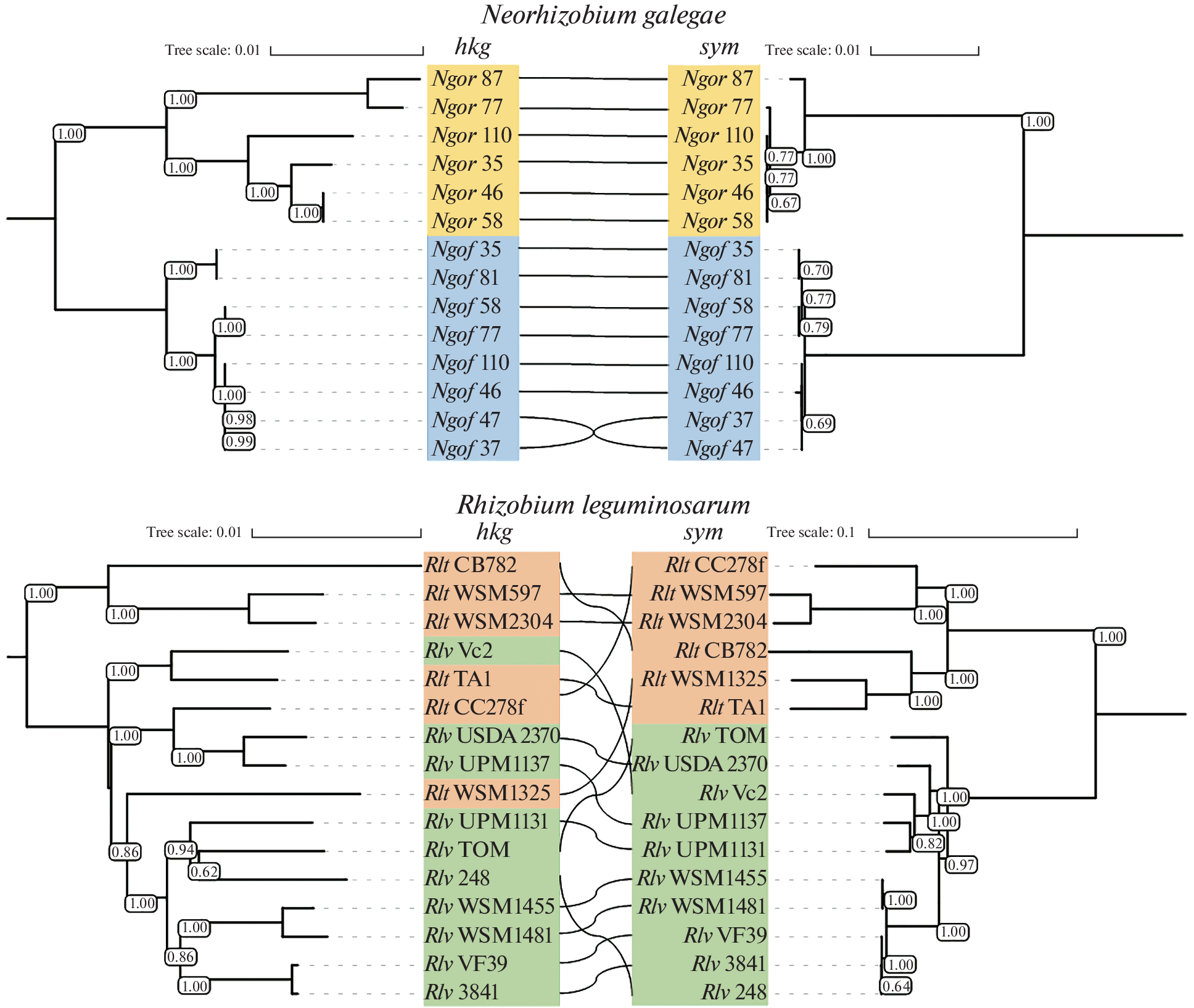 The polytypic species of nodule bacteria Rhizobium leguminosarum (includes biovars viciae and trifolii) and Neorhizobium galegae (biovars orientalis and officinalis) differ in the nucleotide polymorphism of housekeeping genes (hkg) and of symbiotically specialized genes (sym) that control the formation of N2-fixing nodules in leguminous plants. In R. leguminosarum, p-distance values for sym genes are higher than for hkg genes in strains from the same and from different biovars. In N. galegae, differences between biovars in sym genes are higher than in hkg genes while within biovars, polymorphism in sym genes is lower than in hkg genes. Coefficients of biovar differentiation for both groups of genes are higher in N. galegae than in R. leguminosarum, possibly reflecting the spatial isolation of N. galegae biovars. In these species of rhizobia, the phylogenetic congruence of sym and hkg genes is more pronounced in N. galegae than in R. leguminosarum. This difference indicates an active transfer of sym genes in R. leguminosarum populations possibly representing an important factor of the deep diversification for symbiotic traits in this rhizobia species.
