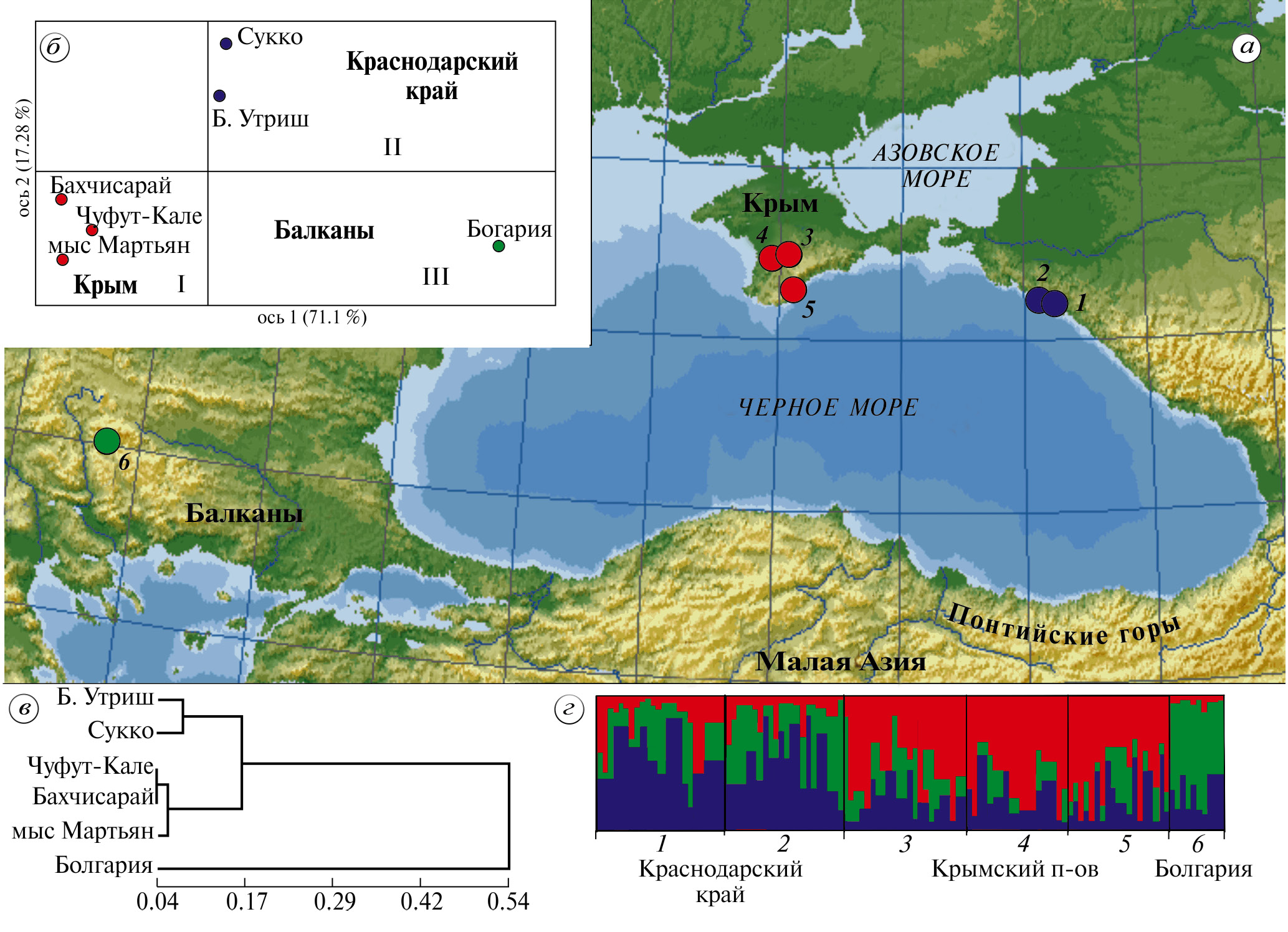 Степень генетической дифференциации между всеми анализируемыми популяциями FST = 14%. Согласно тесту Мантела, наблюдается высокий коэффициент корреляции по генетическим расстояниям между популяциями J. deltoides, основанный на частотах SSR-маркеров, и географическими расстояниями между ними (r = 0.869, p = 0.06). В результате пространственного анализа молекулярной изменчивости (SAMOVA) все популяции делятся на три группы по географическому расположению: Болгария, Крым и Краснодарский край. Дифференциация между этими же тремя группами была выявлена при помощи анализа главных координат на основании генетических дистанций между популяциями (рис. 2,б). Крымские популяции значительно отделены от остальных по первой главной координате (71.1% от общей изменчивости). Согласно второй главной компоненте, популяция из Болгарии дифференцируются от популяций Краснодарского края (17.28% изменчивости). На UPGMA-дендрограмме видно, что наибольшие генетические дистанции между болгарской популяцией и всеми крымско-кавказскими (рис. 2,в). Такие же три группы выявились при оценке данных STRUCTURE (K = 3, ΔK = 5.18) (рис. 2,г). Применение AMOVA для трех генетических кластеров показало статистически значимую дифференциацию (9.9% от общей изменчивости, P < 0.001).