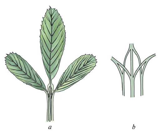 2. Fig. 1. Illustration of a triple leaf, made according to Fig. 12 from the work of E.A. Mokeeva [19, p. 26] a – general plan of the leaf with vessels and veins; b – close-up of the divergence of the bundles of lateral and upper leaflets on the second and third branches, respectively.