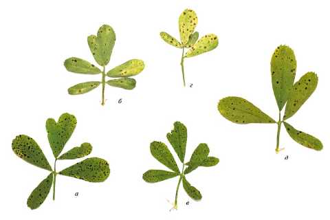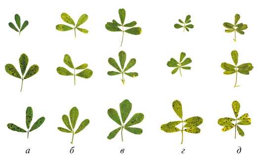 Рис. 2. Вариация листьев на одном из образцов лаборатории селекции люцерны: дикий тип – a (три листочка); многолисточковый – б, в, г, д (от четырех до семи листочков соответственно).
