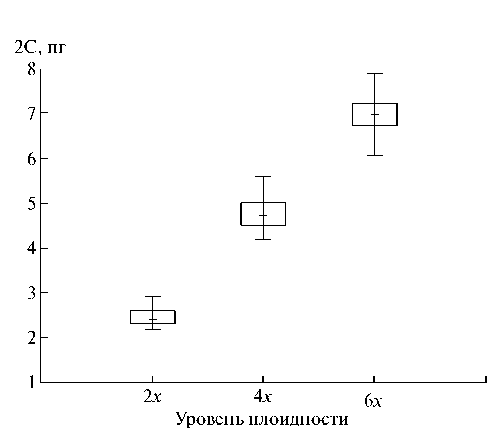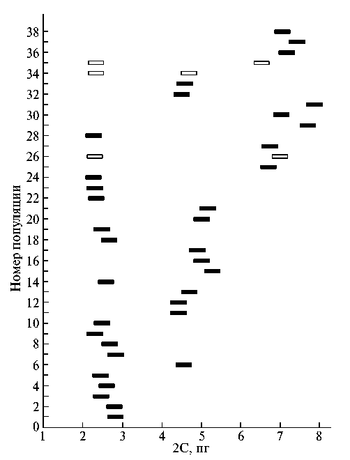 Соотношение размера генома с уровнем плоидности установлено (откалибровано) параллельным подсчетом хромосом и измерением размера генома у образцов из четырех популяций. В популяции 28 отмечены диплоиды (2n = 2x = 18; 2С = 2.27 пг), в популяциях 9 и 17 диплоиды (2n = 2x = 18; 2С = 2.30 пг) и тетраплоиды (2n = 4x = 36; 2С = 4.90 пг) соответственно. В популяции 36 выявлены гексаплоиды (2n = 6x = 54; 2С = 7.16 пг). Размер генома (2С, пг) был определен у 309 растений из 38 популяций (табл. 1). Для оценки различий по содержанию ДНК в ядрах был использован статистический анализ ANOVA. Все значения распределились в три группы, в каждую из которых попали, в том числе, образцы, изученные кариологически (рис. 2, 3), что свидетельствует о том, что образцы каждой группы являются различными цитотипами.