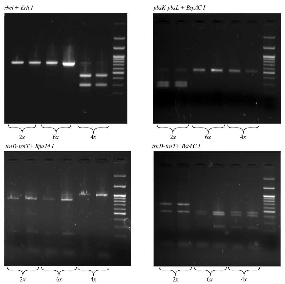 Рис. 4. Электрофореграммы рестрикции участков хлоропластной ДНК для образцов Bassia prostrata s. l. различной плоидности. 2х – диплоиды (популяция 14), 4x – тетраплоиды (популяция 18), 6x – гексаплоиды (популяция 38). Дорожка справа – маркер молекулярных масс 100 пн + 1.5 + 3 тпн.