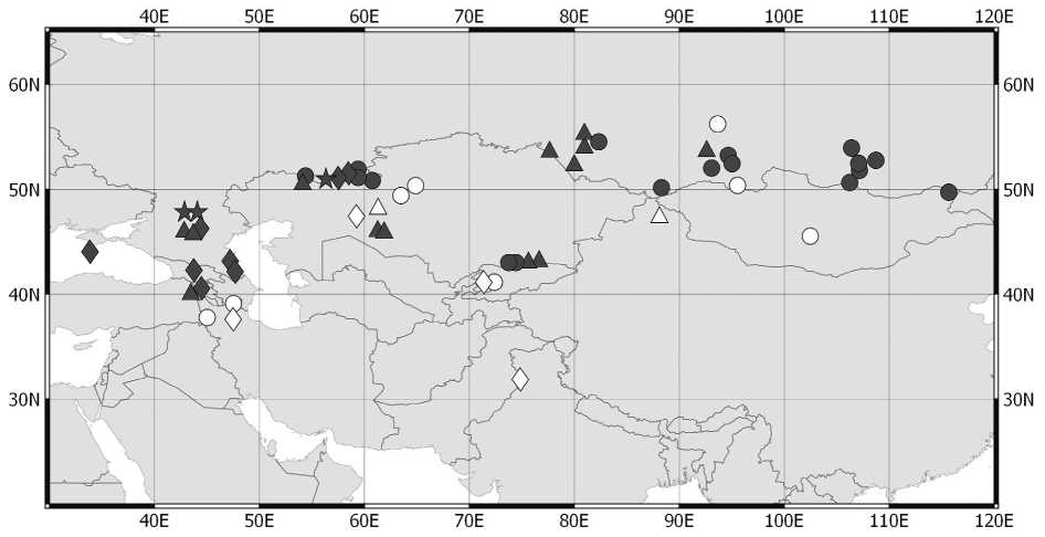 Рис. 6. Географическое распространение цитотипов B. prostrata по данным размера генома. Серые значки – наши данные, белые – по литературным источникам; уровень плоидности: круг – 2x, треугольник – 4x, ромб – 6x, звезда – миксоплоидная популяция.