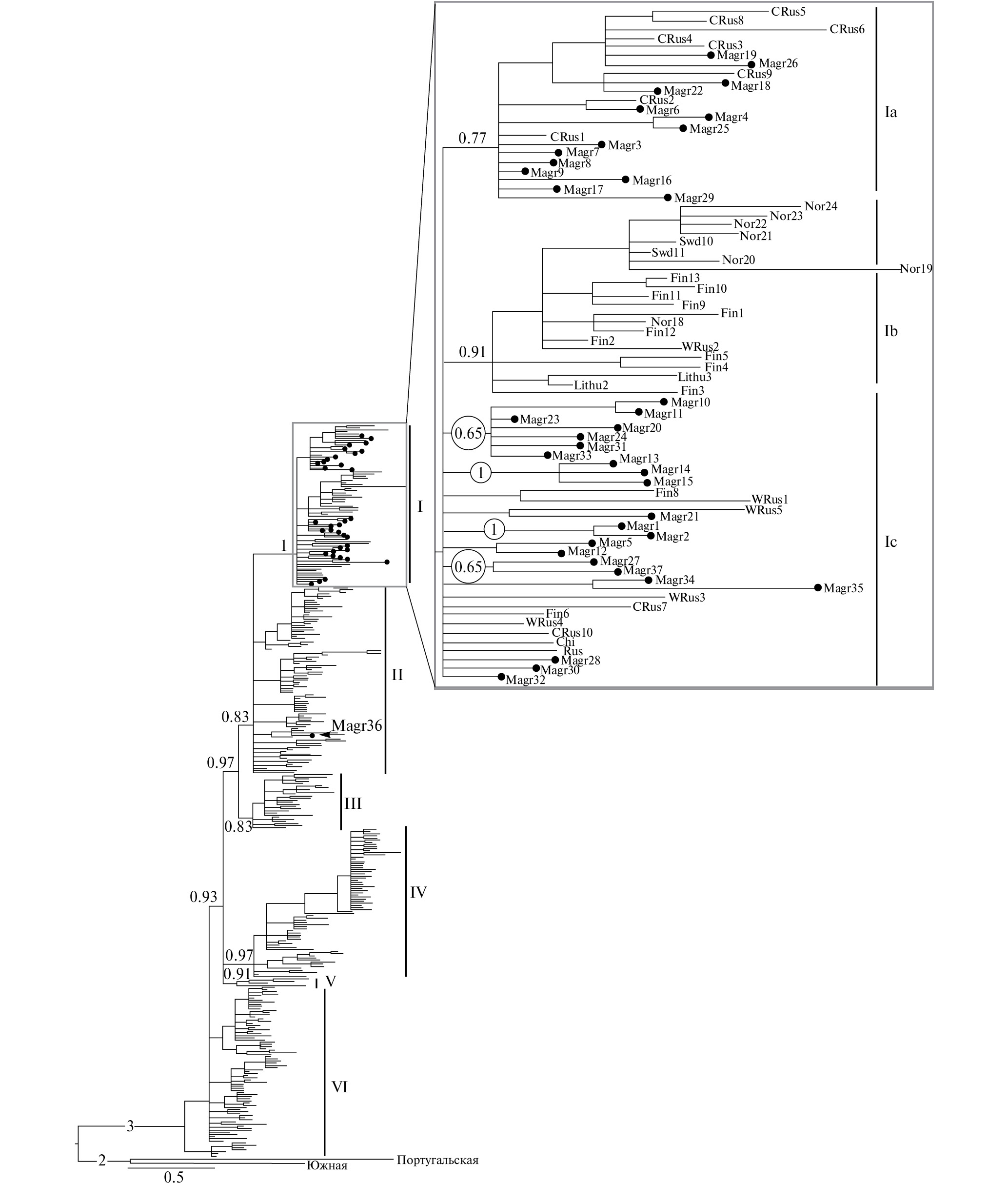 Рис. 2. Филогенетическое дерево M. agrestis, реконструированное методом Байесова анализа для 348 гаплотипов cytb (1140 пн). I–VI – клады: I – Восточная, II – Центрально-Европейская, III – Скандинавская, IV – Западно-Европейская, V – Французская, VI – Северо–Британская. Ia–Ic – группы гаплотипов Восточной клады. Черные круги – оригинальные гаплотипы (Magr1–Magr37). Цифры над ветвями – постериорные вероятности (BI > 0.70). Окружности с цифрами на ветвях гаплогруппы Ic – постериорные вероятности (BI > 0.65) для подгрупп, включающих гаплотипы с территории Урала