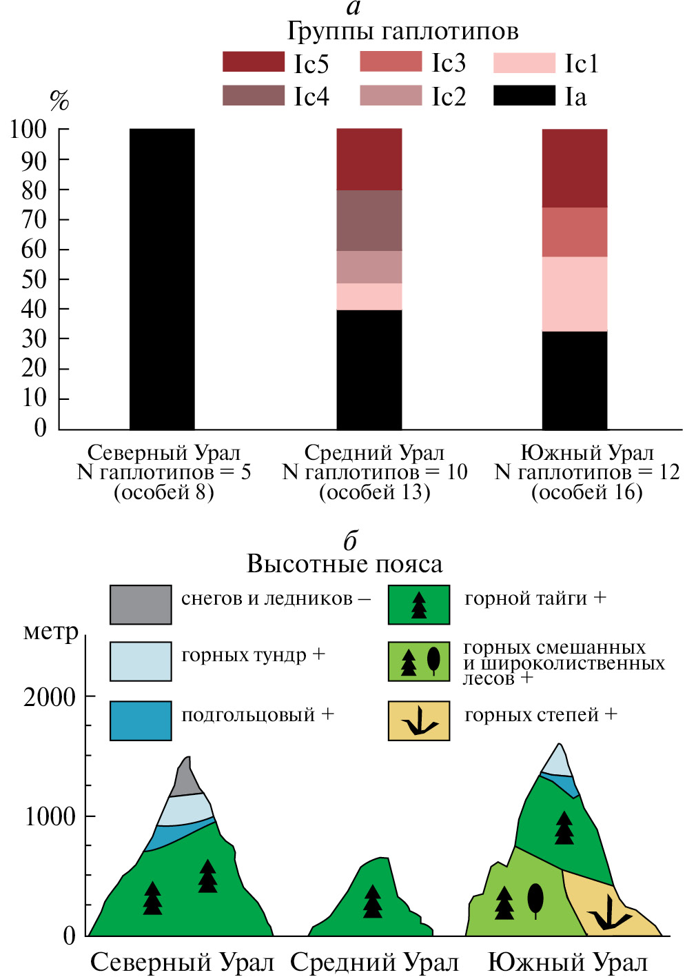 Гаплотипы группы Ia обнаружены на Северном Урале на восточном склоне (окрестности городов Ивдель и Серов) и в западных предгорьях (Печоро-Илычский заповедник); на Среднем Урале – в Висимском заповеднике и в окрестностях г. Екатеринбург; на Южном Урале – в Ильменском заповеднике, на горе Иремель и в окрестностях пос. Метлино. Эти локалитеты относятся к зонам северной, средней, южной тайги, предлесостепных лесов и горно-лесостепному участку Южного Урала. Расположение группы Ia на территории Евразии и особенности пространственного распределения гаплотипов на Урале (рис. 4) позволяют охарактеризовать область ее распространения как субаркто-бореальную. Поскольку гаплотипы с разных склонов Урала близки, можно предполагать, что формирование Ia связано с развитием современного таежного биома. Базальное положение для группы имеет гаплотип из Печоро-Илычского заповедника, расположенного на границе средней и северной тайги.