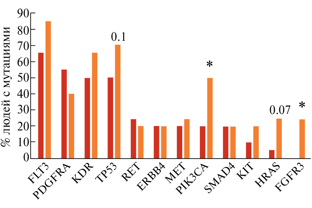 Было выявлено, что в буккальном эпителии мутации в гене FLT3, встречаются у 85% пациентов с раком легкого, в то время как у контрольной группы только в 55.6% случаев (p = 0.08 по χ2 Пирсона). Мутации в гене PDGFRA встречаются у 40% пациентов с раком легкого и 11.1% людей из контрольной группы (p < 0.05 по χ2 Пирсона). Мутации в гене KDR встречаются у 65% пациентов с раком легкого и 22.2% людей из контрольной группы (p < 0.05 по χ2 Пирсона). Мутации в гене PIK3CA встречаются у 50% пациентов с раком легкого и у 11.1% людей из контрольной группы (p < 0.05 по χ2 Пирсона). Мутации в гене HRAS встречаются у 25% пациентов с раком легкого и 11.1% людей из контрольной группы (p = 0.09 по χ2 Пирсона). У контрольной группы не было обнаружено мутаций в буккальном эпителии в гене FGFR3, в то время как 25% пациентов с раком легкого были выявлены мутации (p < 0.05 по χ2 Пирсона).