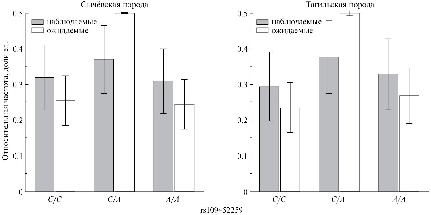 Из представленных данных видно, что в двух случаях по полиморфизму rs109452259 были выявлены статистически значимые отклонения распределения аллелей от равновесных по Харди−Вайнбергу. Такие отклонения могли возникнуть вследствие множества причин: действия отбора, изменчивости числа копий гена, инбридинга и субструктурирования популяции [18, 19]. Наиболее вероятной интерпретацией отклонения от равновесия Харди−Вайнберга является именно действие отбора, который, как видно из сравнения наблюдаемых и ожидаемых частот, у обеих пород происходит против гетерозигот по rs109452259 (рис. 1).