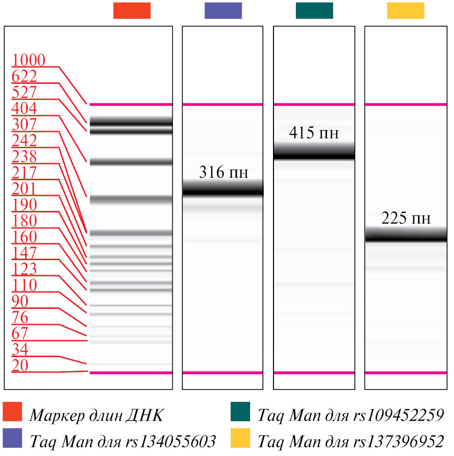 Рис. 2. Результаты капиллярного электрофореза продуктов амплификации, получаемых при использовании разработанных TaqMan-систем генотипирования.