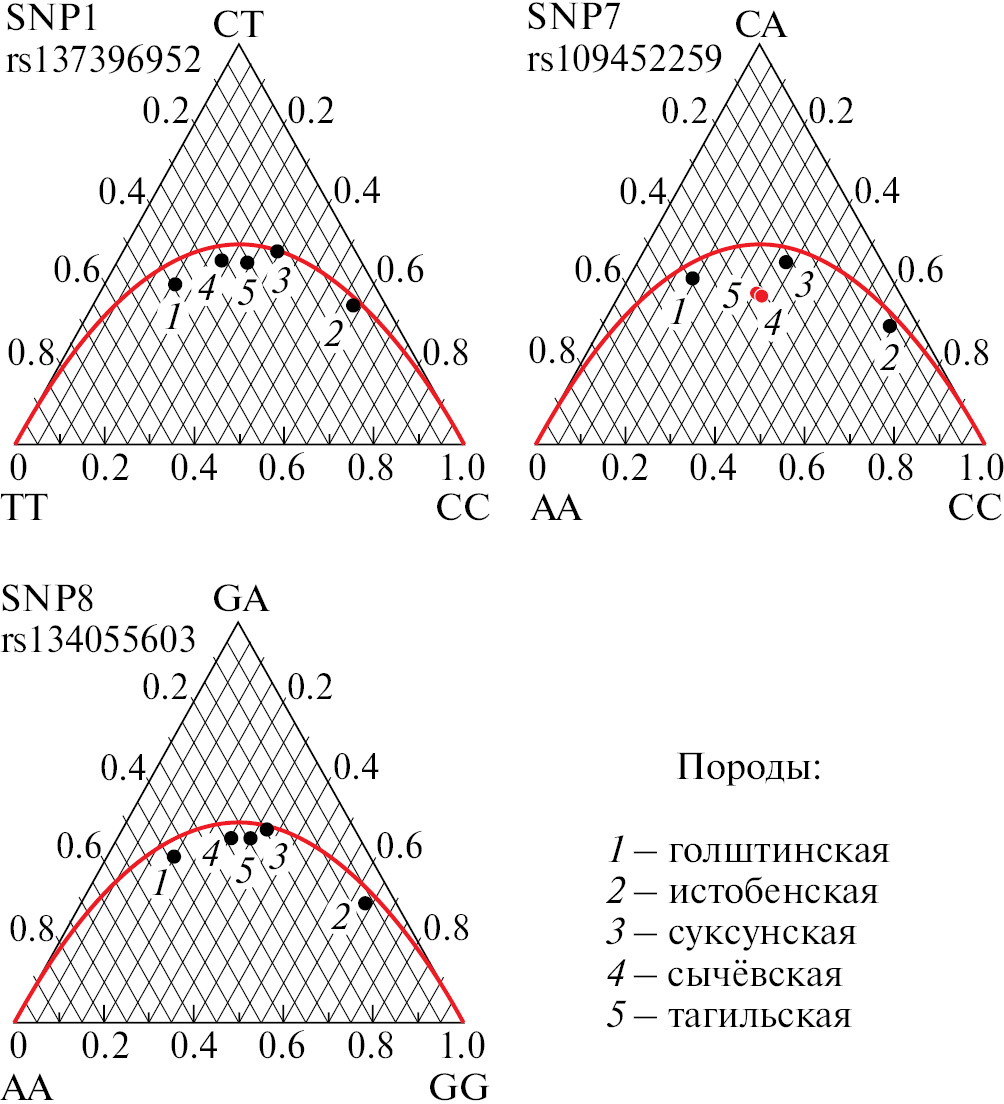 Поскольку для всех трех SNP известны предковые аллели, рис. 3 позволяет также оценить степень насыщения генотипов пяти популяций мутантными вариантами. Гомозигота по предковому аллелю находится в нижнем правом углу диаграммы де Финетти, а гомозигота по мутантному – в левом. Видно, что для всех трех SNP максимально близкой к предковому генотипу является истобенская порода, а наиболее отдалённой от него – голштинская. В популяционной генетике мутантный аллель часто называют “редки ввиду его меньшей распространенности в популяции. Однако в данном случае мутантные варианты нельзя назвать редкими: в суксунской, сычевской и тагильской популяциях предковых и мутантных аллелей было примерно поровну (см. табл. 3), а у голштинского скота мутантные варианты встречались примерно в 2 раза чаще предковых.