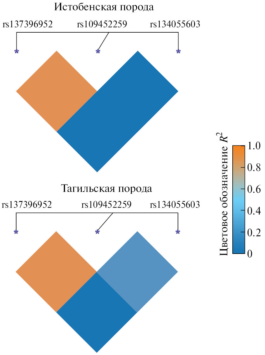 При анализе неравновесного сцепления (linkage disequilibrium) выявлено, что для истобенской и тагильской пород наблюдаются неравновесные сцепления для пар SNP rs137396952−rs134055603, rs109452259−rs134055603 (рис. 5). Значения коэффициента R2 для истобенской породы в первой паре SNP равно 0.16, а во второй – 0.13. Для тагильской породы в первой паре SNP коэффициент имеет значение 0.29, во второй – 0.38 соответственно.