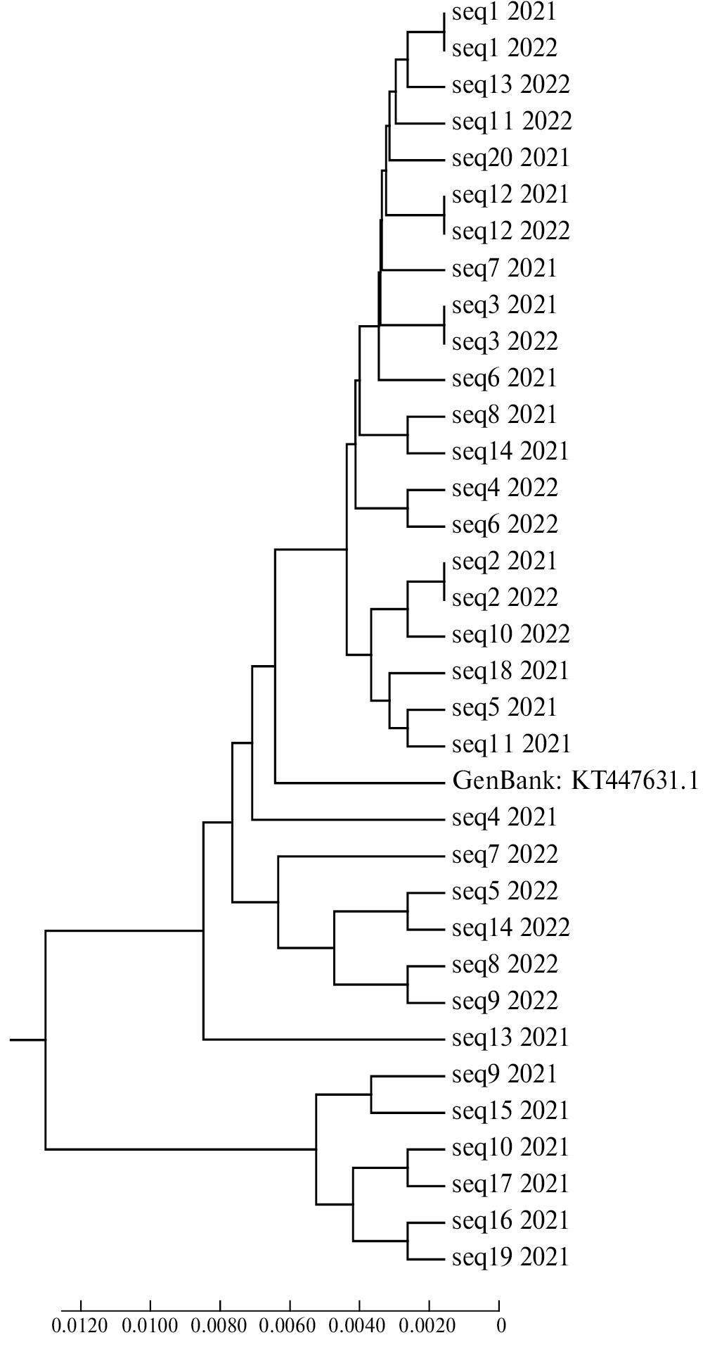 Рис. 1. Разнообразие фрагмента митохондриального гена ND4 длиной 438 пн в выборках Rh. padi. Анализ 34 нуклеотидных последовательностей выполнен в программе MEGA7 [13] с помощью алгоритма UPGMA (метод невзвешенной попарной группировки с усреднением) [17].