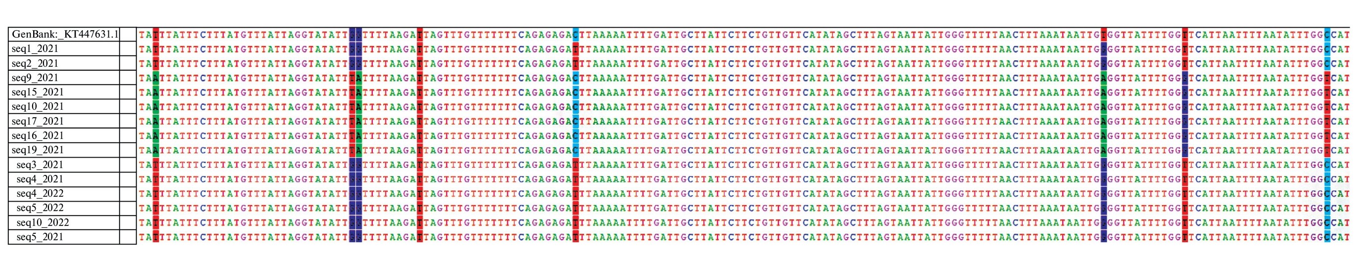 Рис. 2. Выравнивание некоторых нуклеотидных последовательностей, обнаруженных в выборках Rh. padi. Уникальные замены, обнаруженные в выборке насекомого, собранной в 2021 г. на пшенице, выделены цветом.