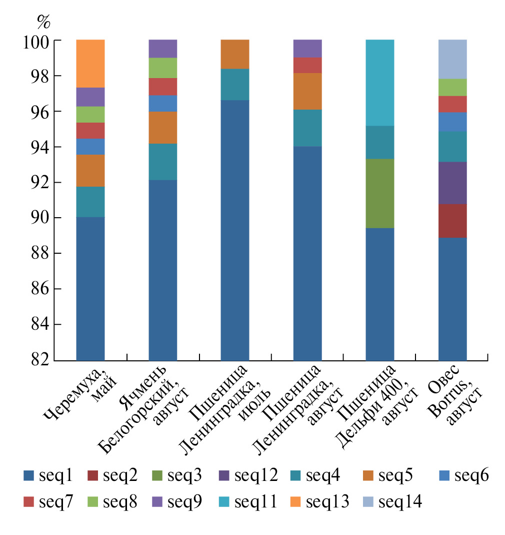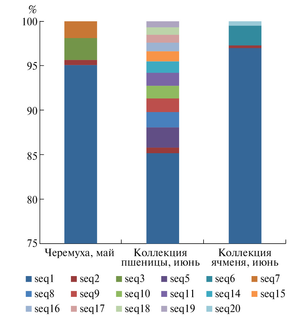Мы исследовали выборки Rh. padi, питавшиеся в северо-западном регионе России в 2021 г. на разных растениях: весной на черемухе, летом на разных сортах пшеницы и ячменя, и обнаружили, что при переходе с черемухи на злаки варьирует суммарная доля гаплотипов seq1 и seq2: от 95.6 до 85.8 и 97.3% соответственно, а также состав минорных гаплотипов в выборке. Уникальными для собранной на черемухе выборки оказались гаплотипы seq3 и seq7, которые “терялись” при миграции популяции летом на злаки, где были выявлены “новые”: 11 гаплотипов – на пшенице и два – на ячмене. Суммарная доля “новых” гаплотипов варьировала и составила 12.4% на пшенице и 2.8% на ячмене (рис. 3).