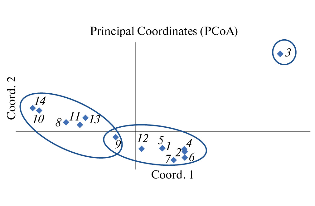 Рис. 5. Многомерная диаграмма генетического сходства по гаплотипам мтДНК между выборками Rh. padi (1–14) по индексу фиксации Fst. 1 – Дагестан, дикое сорго, 04.2021; 2 – С.-Петербург, черемуха, 05.2021; 3 – С.-Петербург, коллекция пшеницы, 06.2021; 4 – С.-Петербург, коллекция ячменя, 06.2021; 5 – Краснодарский край, коллекция ячменя, 07.2021; 6 – Краснодарский край, сорго (сорт СЛВ-2), 07.2021; 7 – Краснодарский край, сорго (Ефремовское белое), 07.2021; 8 – Дагестан, пшеница (Безостая 1), 05.2022; 9 – С.-Петербург, пшеница (Ленинградка), 07.2022; 10 – С.-Петербург, ячмень (Белогорский), 08.2022; 11 – С.-Петербург, пшеница (Ленинградка), 08.2022; 12 – С.-Петербург, пшеница (Дельфи 400), 08.2022; 13 – С.-Петербург, овес (Borrus), 08.2022; 14 – С.-Петербург, черемуха, 05.2022.