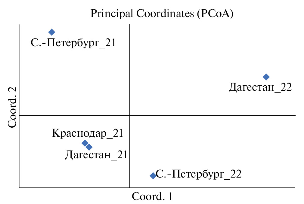 Генетические различия между 14 выборками тли оценивали с помощью индекса фиксации Райта Fst [15], который рассчитывали в программе GenAlEx 6.5 (Genetic analysis in Excel, 6.5 http://biology.anu.edu.au/GenAlEx) [16]. Многомерная диаграмма сходства между выборками Rh. padi по минорным гаплотипам мтДНК построена с помощью опции Principal Coordinates (PCoA).