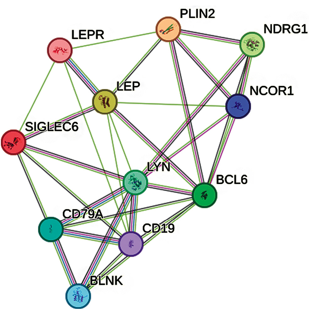 Для изучения функциональных связей между изучаемыми вариантами шести генов, входящих в модели MDR, дополнительно применяли сетевой анализ в онлайн-ресурсе Polympact (https://bcglab.cibio.unitn.it/polympact/). Примечательно, что из пяти изученных SNP (в данном ресурсе не представлено данных для rs3774298 гена BCL6) только варианты генов LEP и SIGLEC6 локализованы в сайтах связывания общих факторов транскрипции (рис. 2).