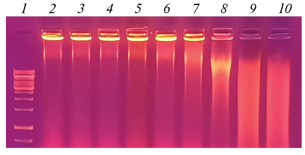 Рис. 3. Результаты гель-электрофореза генетического материала нематоды С. elegans, подвергнутой воздействию фурацилина в разных концентрациях (моль/л): 1 – маркер, 2 – вода (контроль), 3 – 0,000005, 4 – 0,00001, 5 – 0,00002, 6 – 0,00005, 7 – 0,0001, 8 – 0,00025; положительные контроли: 9 – БПЛ 0,015 моль/л и 10 – перекись водорода 0,1 моль/л.