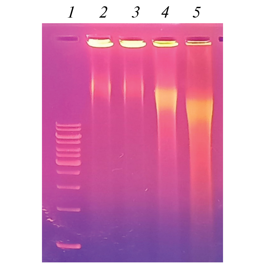 Рис. 4. Результаты гель-электрофореза генетического материала нематоды C. elegans, подвергнутой воздействию фурацилина в концентрации 0,00025 и АЦЦ в концентрациях 0,01 и 0,001 моль/л: 1 – маркер, 2 – вода (контроль), 3 – фурацилин 0,00025 + АЦЦ 0,01, 4 – фурацилин 0,00025 + АЦЦ 0,001, 5 – фурацилин 0,00025 моль/л.