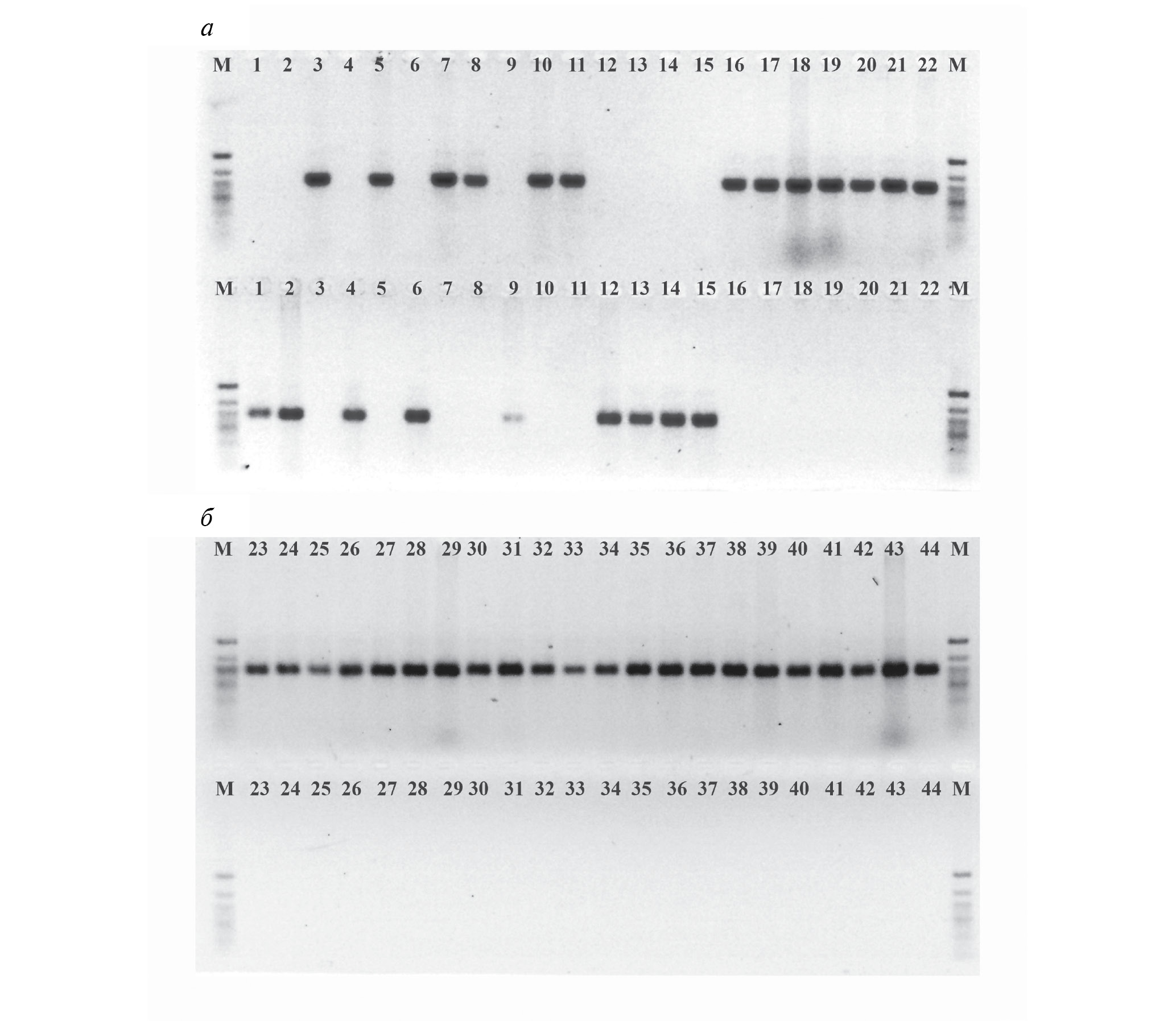 Рис. 2. Электрофорез в 2.5%-ном агарозном геле продуктов (394 пн) ПЦР-амплификации на геномной ДНК 44 инбредных линий кукурузы с праймерами, разработанными для аллелей дикого (PSY155R/PSY155FG; верх каждого геля) и мутантного (PSY155R/PSY155FC; низ каждого геля) типа. а – белозерные линии (1–22). У девяти образцов обнаружен аллель ZmPSY1 дикого типа, и 13 образцов содержали мутантный аллель; б – желтозерные линии (23–44). У всех 22 образцов показано присутствие аллельного варианта ZmPSY1 дикого типа. Нанесение образцов соответствует порядковым номерам линий в таб. 1; М – маркер длин ДНК GeneRuler Low Range (первые четыре полосы сверху вниз: 700, 500, 400, 300 пн).