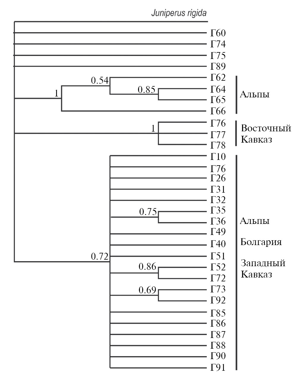 Рис. 3. Байесовское дерево, основанное на гаплотипах хпДНК J. communis с J. rigida в качестве внешней группы.