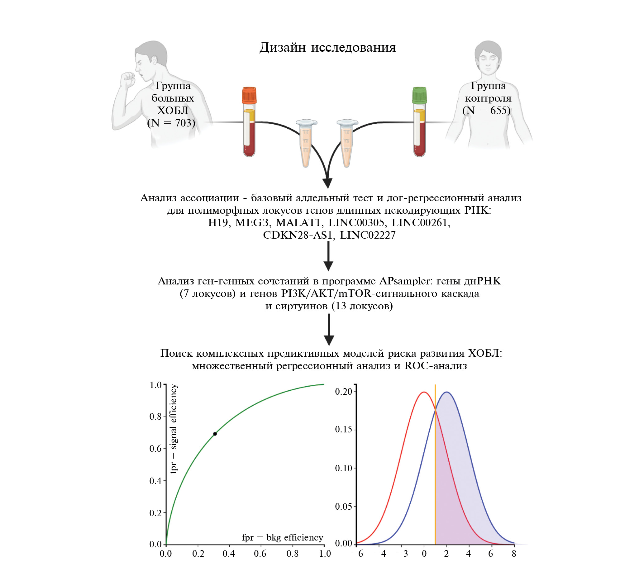 Проведен анализ ассоциации полиморфных вариантов генов днРНК H19, MEG3, MALAT1, Linc00305, Linc00261, CDKN2B-AS, Linc02227 с ХОБЛ, изучен комбинированный вклад генов днРНК и ранее исследованных нами генов PI3K/AKT/mTOR-сигнального каскада и НАД-зависимых деацетилаз семейства сиртуинов в развитие заболевания [11].