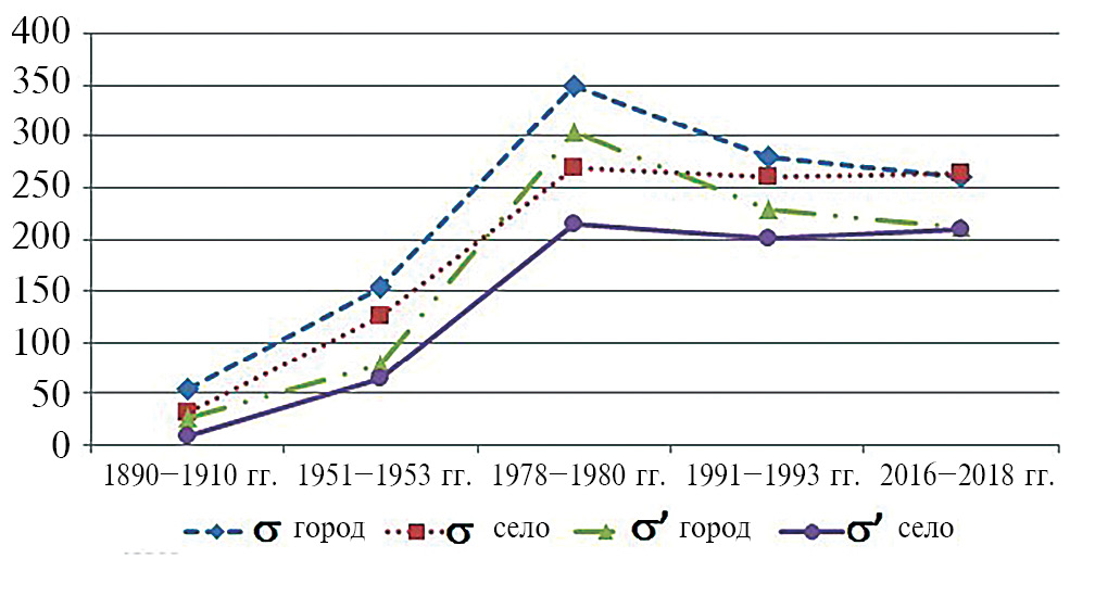 Рис. 1. Динамика среднеквадратических расстояний между местами рождения супругов с учетом дальних миграций (σ) и без учета дальних миграций (σ’) среди городского и сельского населения.