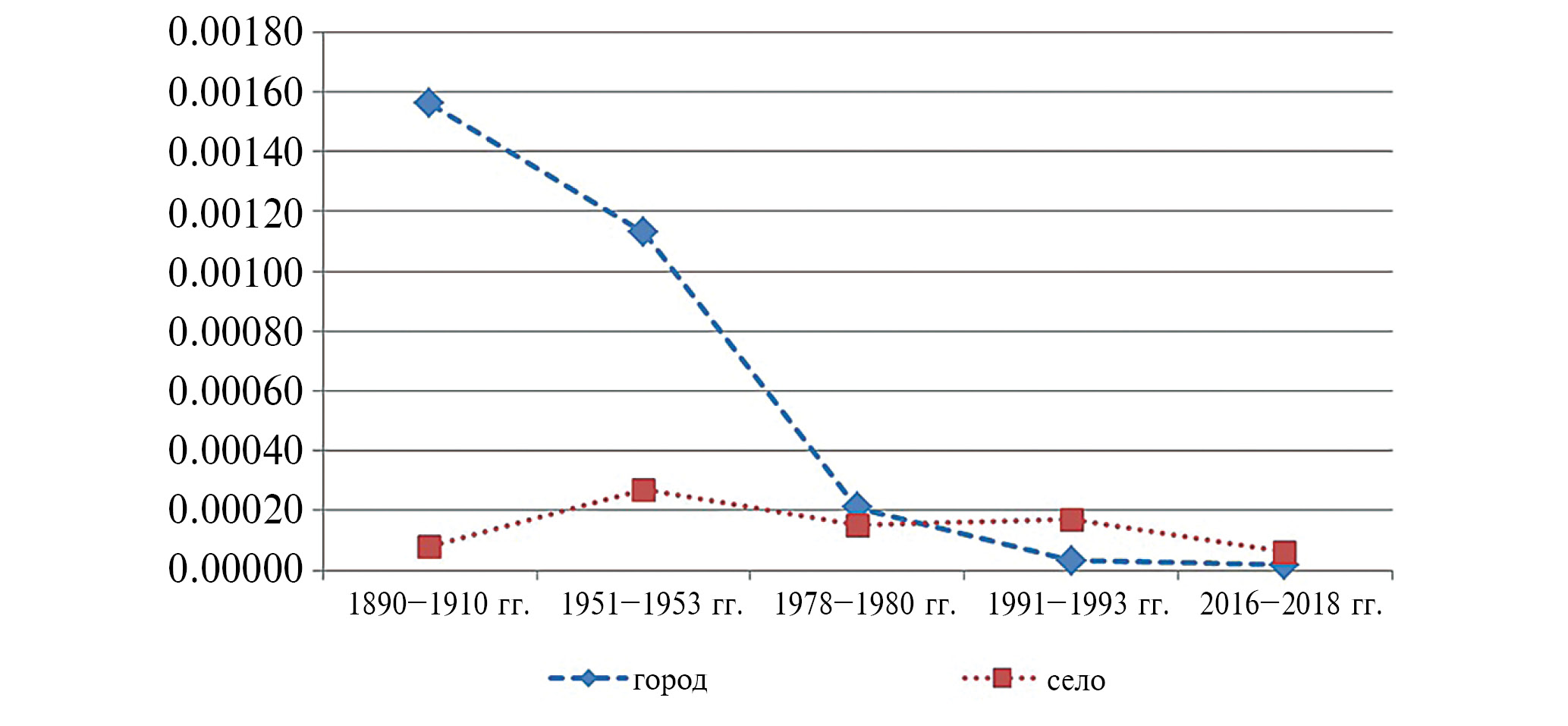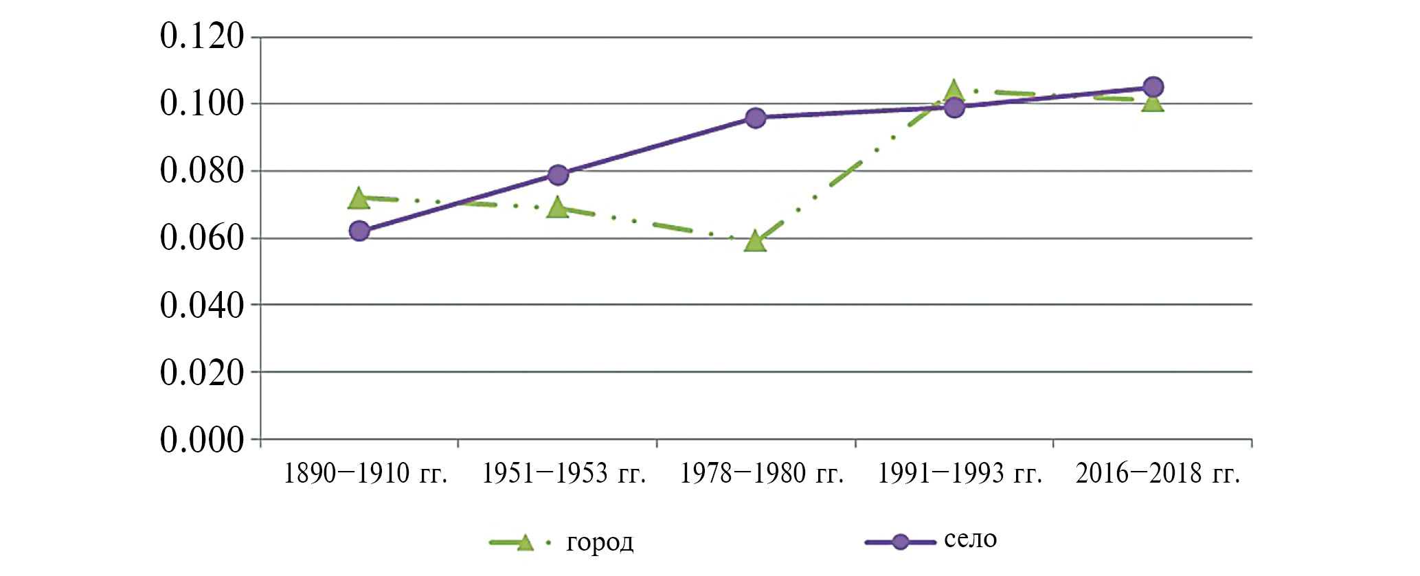 Реверсивной динамикой характеризовался уровень локального инбридинга. Так, если в 1890–1910 гг. значение локального инбридинга в городе было в 19.5 раз выше, чем в селе, то к 2016–2018 гг. показатель локального инбридинга стал в 3 раза выше в селе по сравнению с городом. При этом для городской части популяции наблюдалось стабильно выраженное снижение данного показателя (в 78 раз) в течение всего периода, тогда как в сельской части наблюдалась вариабельность по пяти периодам при уменьшении за 130 лет лишь в 1.3 раза (рис. 5).