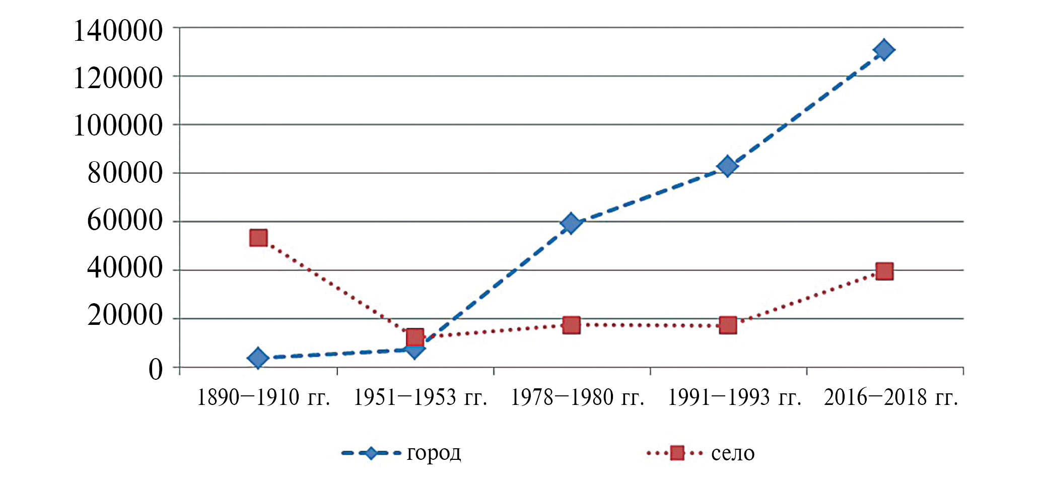 Динамика показателя эффективного размера популяции среди городского и сельского населения была разнонаправлена (рис. 4). В городской части популяции за 130 лет значения эффективного размера популяции увеличились в 33.6 раза, а в сельской части уменьшились в 1.3 раза (рис. 4).