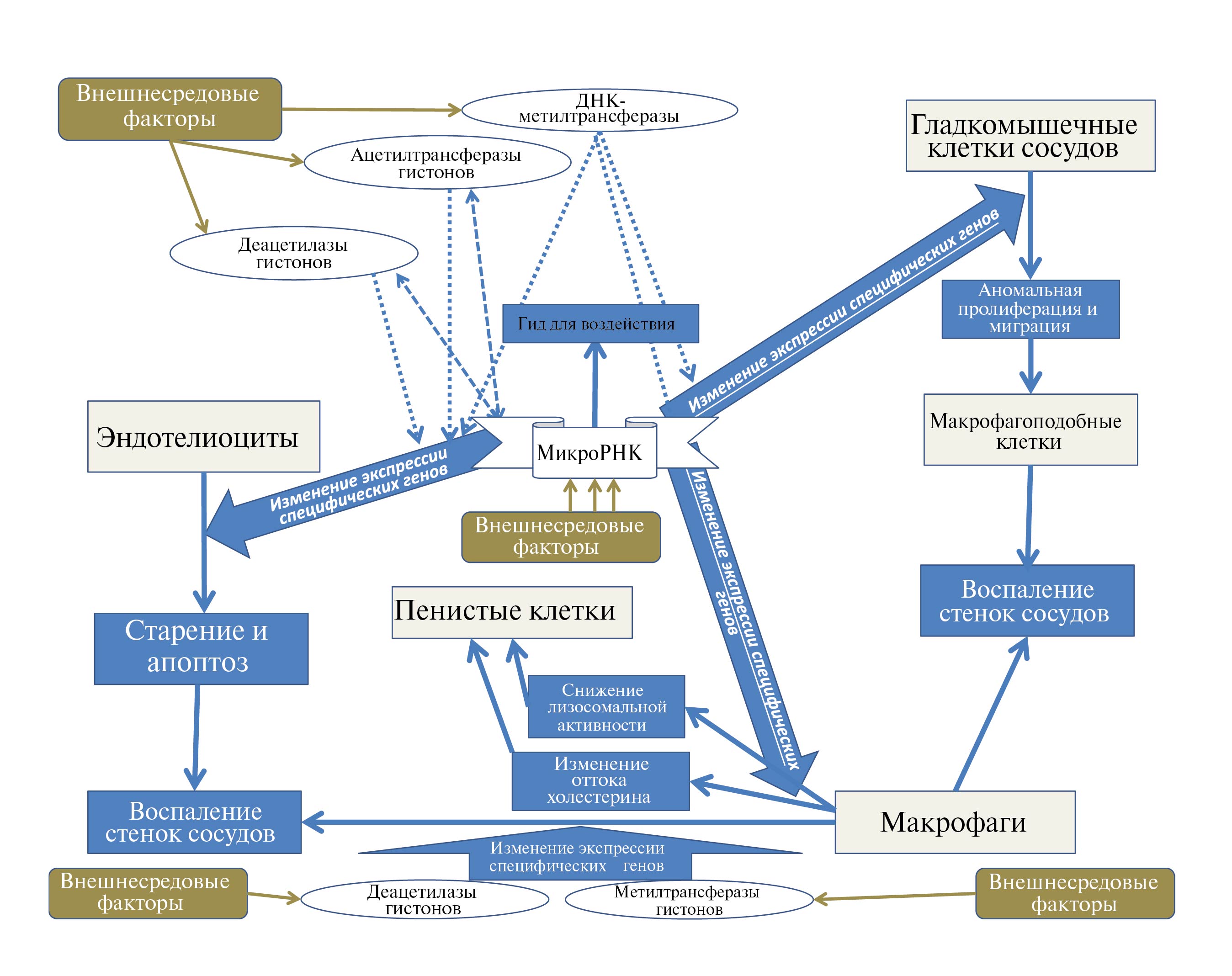 Развитие АС сопровождается изменением экспрессии генов в тканях пораженных сосудов, что обусловлено влиянием эпигенетических факторов, к которым относятся метилирование ДНК, модификации гистонов и РНК-интерференция с помощью микроРНК и длинных некодирующих РНК (нкРНК) [10]. Это сопровождается изменением участвующих в патогенезе АС фенотипов клеток, в том числе эндотелиоцитов (ЭЦ) [4, 11, 12], гладкомышечных клеток сосудов (ГМКС) [13, 14] и клеток иммунной системы [15], а также нарушением метаболизма липидов и воспаления [16] (рис. 1). Проведенное в 2022 г. сравнительное исследование роли эпигенетических факторов в развитии АС показало 47 активированных (гипометилированных) и 90 инактивированных (гиперметилированных) генов при АС, а также 10 ключевых генов АС (CACNA1C, GABBR2, TCF7L2, DCK, NRP1, PBX1, FANCC, CCDC88C, TCF12, ABLIM1), дифференциально экспрессируемых под влиянием микроРНК и патологического метилирования [17]. Метилирование ДНК осуществляют ферменты ДНК-метилтрансферазы DNMT1, DNMT3a, DNMT3b, деметилирование – Тet-метилцитозиндиоксигеназы TET1, TET2, TET3, ацетилирование гистонов – ацетилтрансферазы [10]. Нарушения экспрессии микроРНК описаны как патогенетические факторы развивающегося при старении АС [4, 5], поскольку они изменяют метилирование ДНК по механизмам РНК-направленного ДНК-метилирования, влияя на транскрипцию специфических генов. В данных механизмах микроРНК играют роль гидов для изменения эпигенетических факторов в специфических локусах генома [18], следствием чего являются обнаруживаемые при АС влияния ДНК-метилтрансфераз DNMT1/3a/3b, TET1/2/3, гистоновых ацетилтрансфераз НАТ и деацетилаз HDAC на экспрессию специфических генов [10].