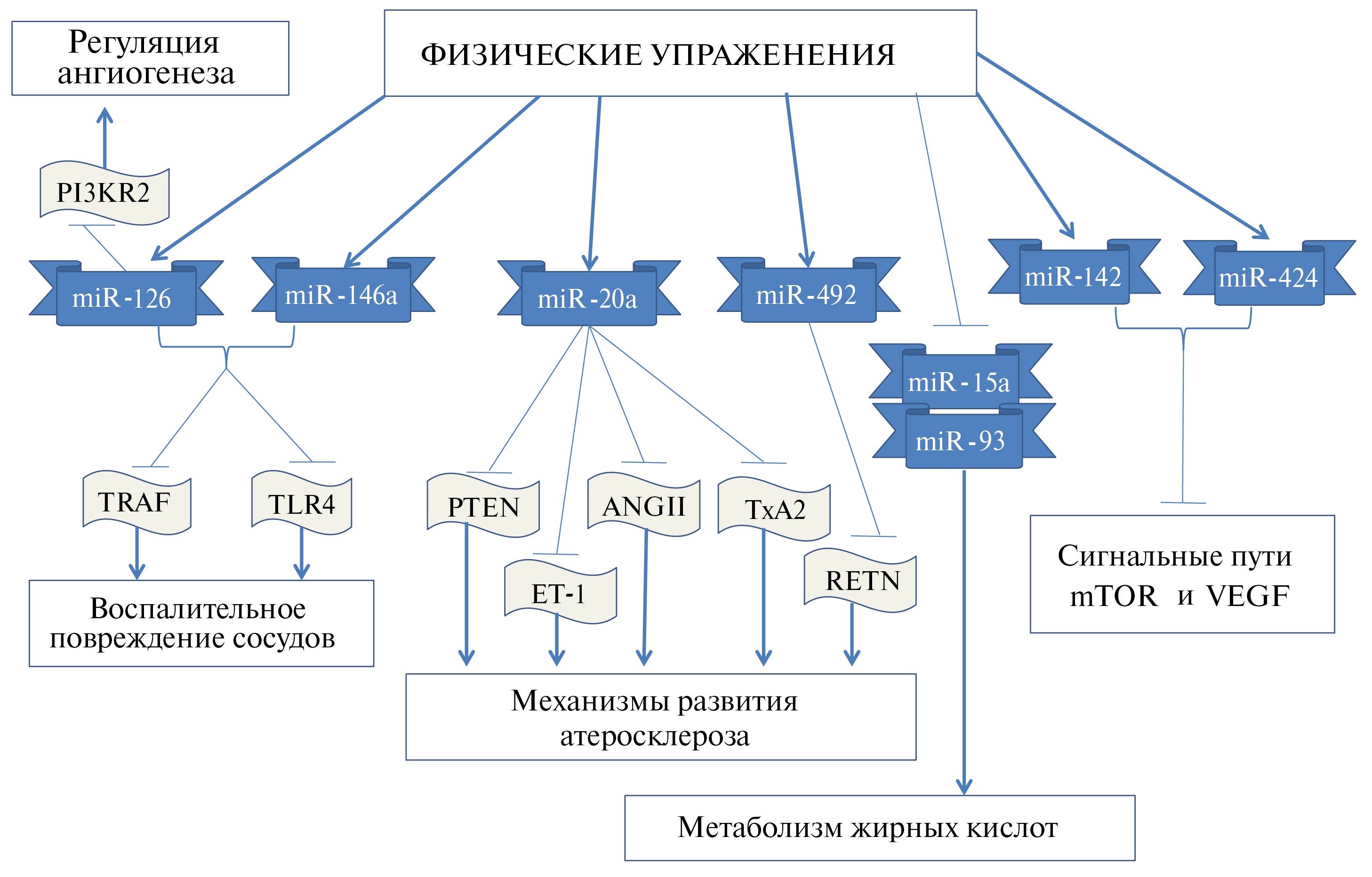 В клинических исследованиях на пациентах с АС коронарных артерий было выявлено снижение уровней miR-15a-5p, miR-93-5p, miR-451a и повышение miR-146a-5p в крови под влиянием физических упражнений. Проведенный биоинформационный анализ показал роль генов miR-15a-5p, miR-93-5p в механизмах биосинтеза и метаболизма жирных кислот [41]. В отношении miR-146a полученные результаты совпадают с данными экспериментов на мышах [38]. Регулярные тренировки в виде ходьбы у пациентов с АС периферических артерий способствовали экспрессии miR-126, которая играет роль в ангиогенезе и адаптации за счет ингибирования PI3KR2, благодаря чему активируется сигнальный путь фактора роста эндотелия сосудов VEGF [42]. Умеренные физические тренировки возрастных пациентов (72 ± 7 лет) с АС периферических артерий способствовали повышению уровней miR-142-5p и miR-424-5p, которые воздействуют на VEGF и mTOR сигнальные пути, препятствуя развитию АС [43]. На рис. 2 представлена схема влияния физических тренировок (согласно данным экспериментальных и клинических исследований) на экспрессию специфических микроРНК, вовлеченных в патогенез АС.