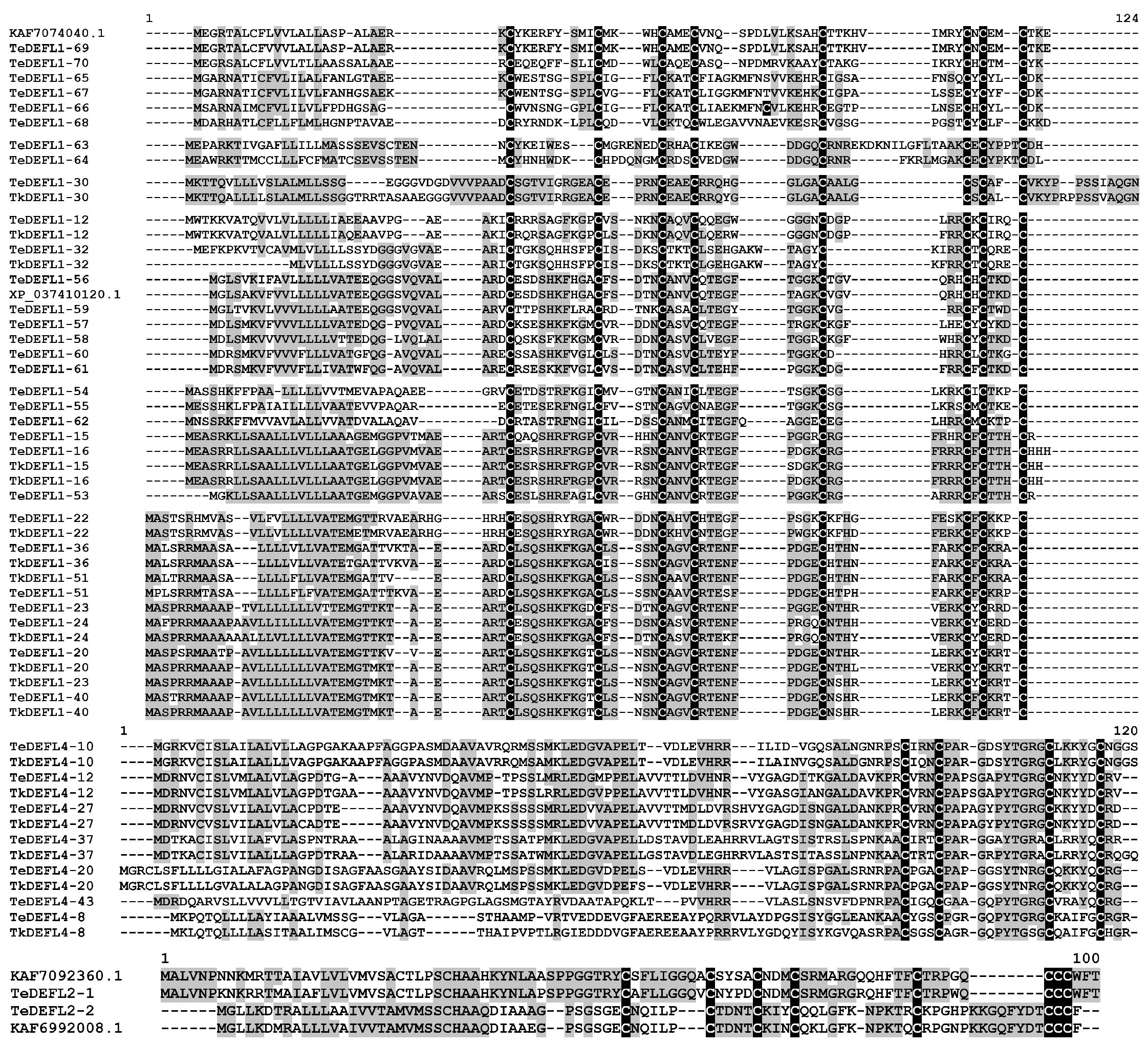 Рис. 1. Выравнивание аминокислотных последовательностей предшественников DEFLs Th. elongatum (Te) и T. kiharae (Tk) [27], а также некоторых дефензинов растений. Консервативные аминокислотные остатки выделены серым цветом. Остатки цистеина в зрелом пептиде выделены белым цветом на черном фоне. Группы сходных пептидов разделены пустой строкой.