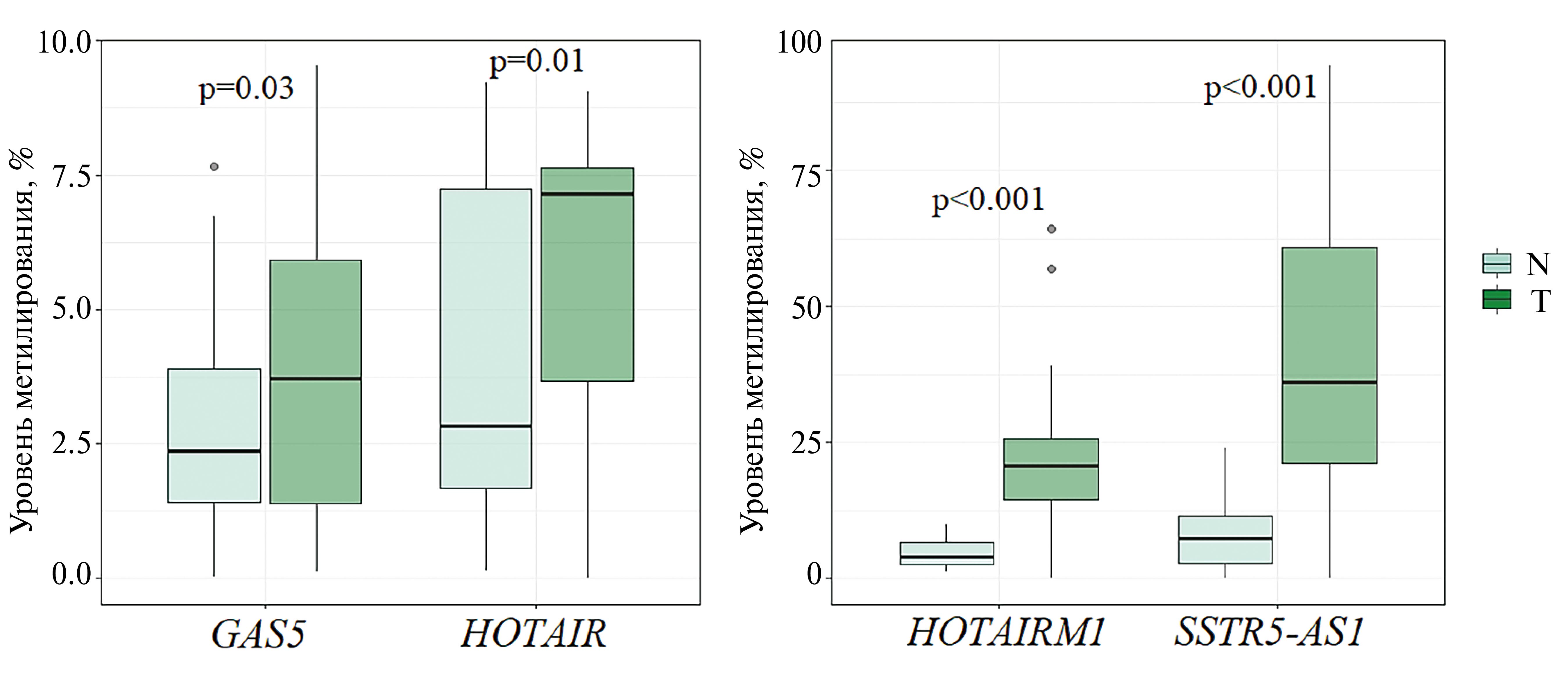 Для отбора генов днРНК, аберрантно метилированных при РМЖ, нами проанализирована база данных MethMarkerDB (https://methmarkerdb.hzau.edu.cn/), которая содержит в себе информацию о 724 метилированных генах биомаркеров из опубликованных статей в PubMed, а также данных полногеномного секвенирования метилирования ДНК (WGBS). Дополнительно для уточнения набора днРНК для дальнейшего собственного экспериментального исследования провели анализ базы данных GeneCards по ключевому слову “EMT” (epithelial-mesenchymal transition), поскольку известно, что эпителиально-мезенхимальный переход (ЭМП) является ключевым процессом прогрессии и метастазирования рака – основной причины смерти больных РМЖ. В результате нами были отобраны четыре гена днРНК – GAS5, HOTAIR, HOTAIRM1, SSTR5-AS1 для анализа уровня метилирования в образцах опухолей молочной железы. Нами показано значимое увеличение уровня метилирования (p < 0.05; критерий Манна–Уитни) в образцах опухоли по сравнению с нормальной прилежащей тканью молочной железы для всех четырех генов днРНК GAS5, HOTAIR, HOTAIRM1, SSTR5-AS1 (рис. 1). Метилирование генов HOTAIRM1 и SSTR5-AS1 при РМЖ показано нами впервые.