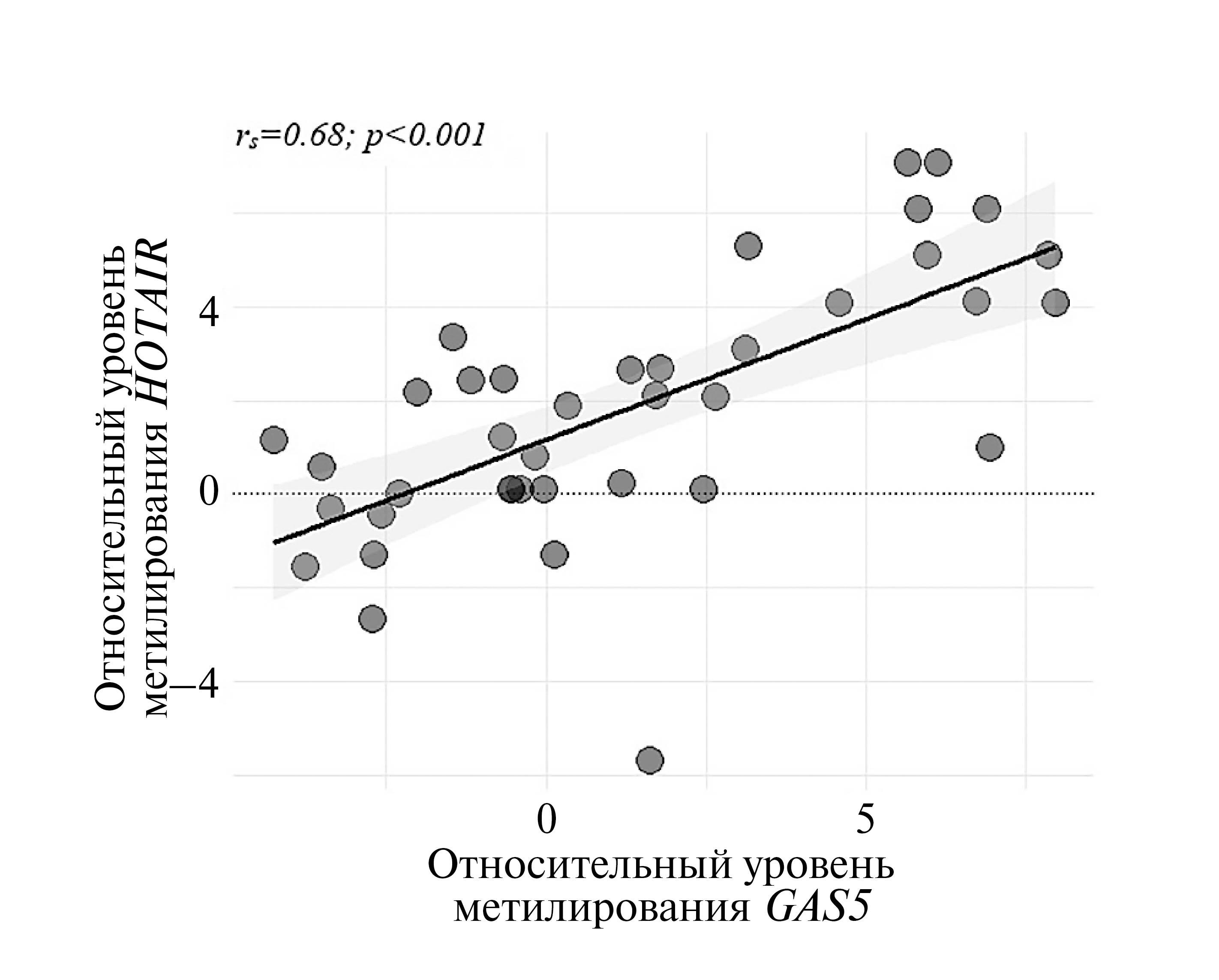 Методом статистического анализа с применением коэффициента корреляции Спирмена с поправкой на множественные сравнения Беньямини–Хохберга установили высокую статистически значимую положительную корреляцию для пары GAS5 – HOTAIR (rs = 0.68; p < 0.001) (рис. 2), а также умеренную положительную корреляцию для пары SSTR5-AS1 – HOTAIRM1 (rs = 0.42; p = 0.04). Таким образом, полученные данные по ко-метилированию генов днРНК, как и биоинформатические предсказания, свидетельствуют об их взаимном участии в общих сигнальных путях и биологических процессах.