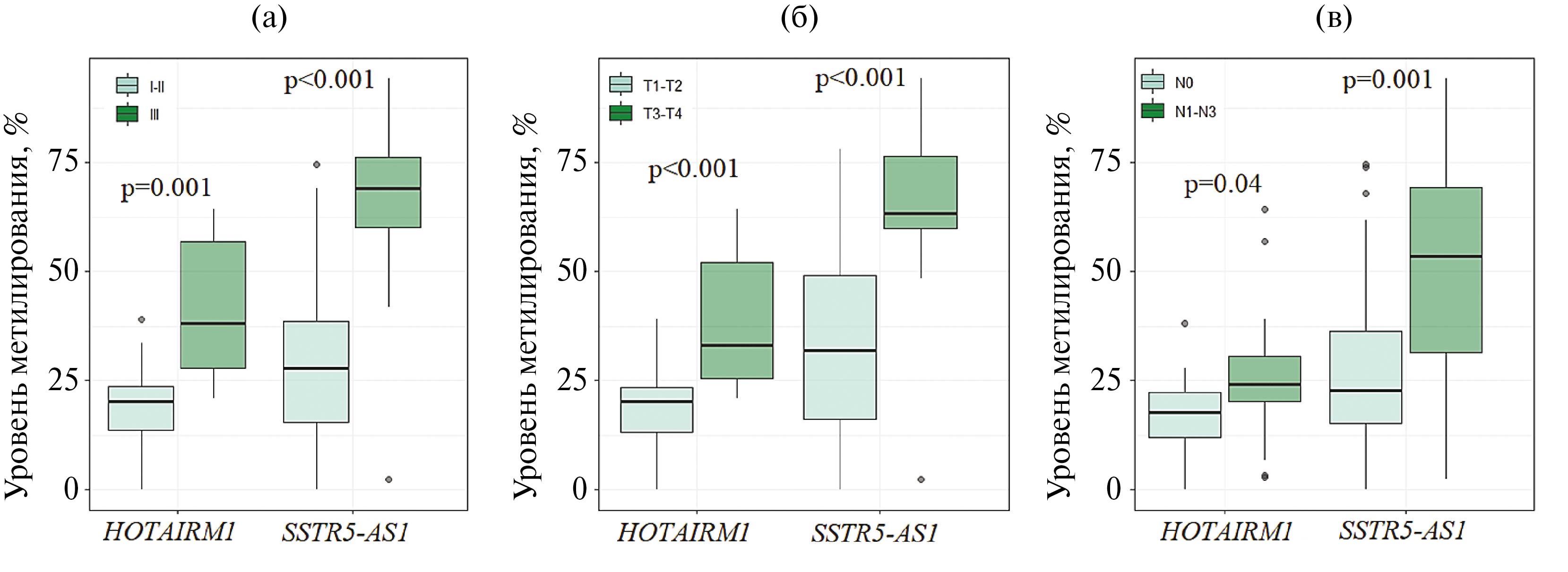 При сравнении уровня метилирования четырех генов днРНК на более поздней стадии (III) по сравнению с таковым на ранних стадиях (I–II) нами показано значимое (p < 0.05) увеличение уровня метилирования на поздней стадии для генов HOTAIRM1 и SSTR5-AS1 (рис. 3, а). Также уровень метилирования генов HOTAIRM1 и SSTR5-AS1 был значимо (p < 0.05) выше в образцах опухолей молочной железы пациенток с размером опухоли T3–T4 по сравнению с T1–T2 (см. рис. 3, б). При оценке уровня метилирования генов днРНК в образцах опухолей молочной железы в зависимости от наличия метастазов нами установлено высокозначимое (p < 0.005) повышение уровня метилирования для генов днРНК HOTAIRM1 и SSTR5-AS1 в образцах с наличием метастазов в лимфатических узлах (N1–N3) (см. рис. 3, в).