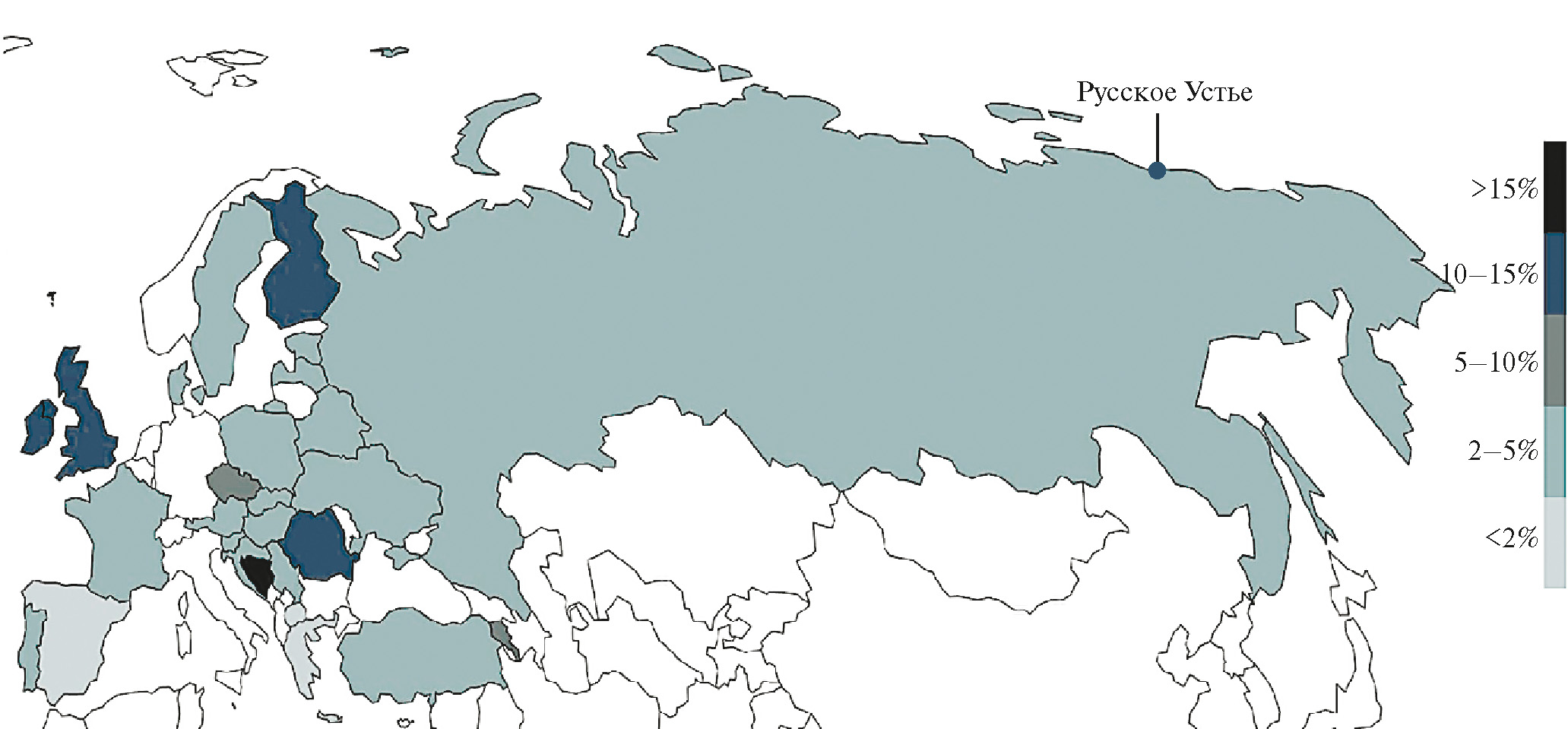 Анализ распространенности гаплогруппы H2 в Евразии показал ее присутствие с частотами, превышающими 10% не только в европейской части континента (Финляндия – 10,4% [37], Румыния – 12,5% [45], Великобритания – 14,9% [46], Босния и Герцеговина – 17,6 и 24,4% [47]), но и на арктическом побережье Якутии, среди популяции русских старожилов – 16,7% (рис. 2). Высокая частота относительно редкой гаплогруппы H2 у жителей с. Русское Устье, вероятно, обусловлена эффектом основателя, поскольку в отличие от гаплогруппы U, которая представлена тремя различными суб-гаплогруппами (U2e, U4a1, U4a2b), гаплогруппа H представлена филогенетически близкими линиями, относящимися к одной субгаплогруппе – H2a, которая была выявлена у пяти не связанных близким родством «досельных» жителей села, причисляющих себя к потомкам выходцев из Поморья (см. табл. 2).