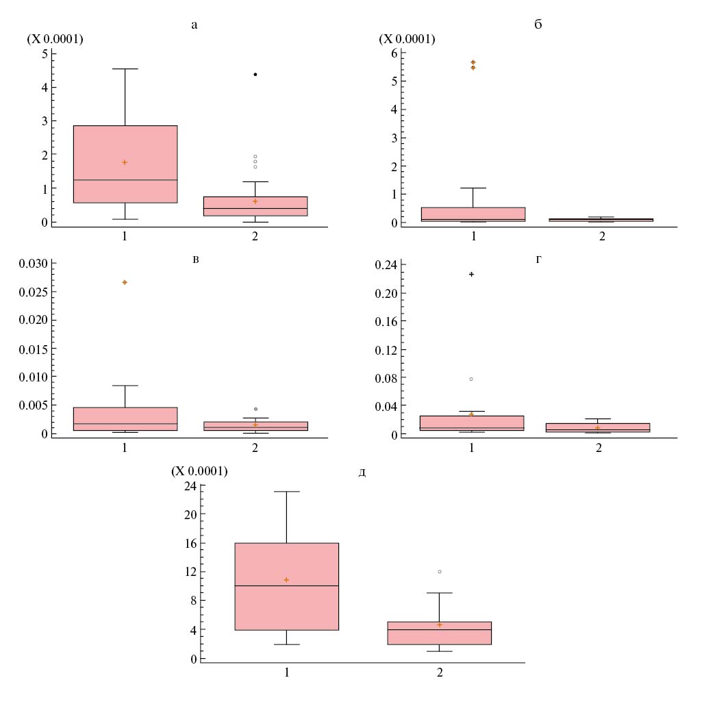 Рис. 1. Уровень экспрессии генов SLFN12L (a), LYST (б), LC3B2 (в), p53 (г) и ATG5 (д) в ЛПК условно здоровых доноров (1) и пациентов с саркоидозом легких (2). Горизонтальные линии внутри прямоугольников –— - медиана, ● – среднее значение.