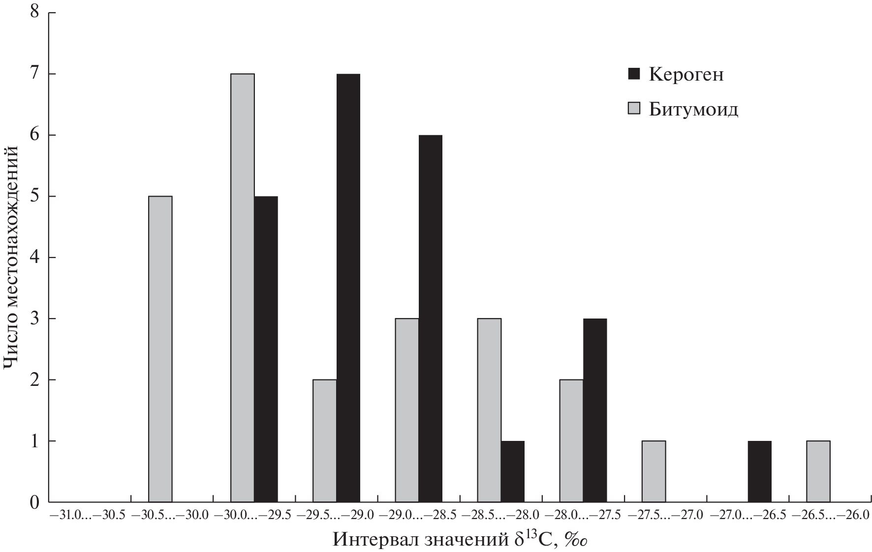 It has been established that the average values of some hydrocarbons biomarker coefficients of bitumens from the Domanik deposits and oils from the Domanik–Tournaisian complex coincide. These are the proportions of C27–C29 steranes, tri-/pentacyclanes ratio, and coefficients 2 × С17/С16 + С18 and 2 × С27/С26 + С28 calculated from n-alkane composition. Such indicators as the Pr/Ph, (Pr + Ph)/(n‑C17 + n‑C18), dia-/reg-steranes, and the sterane/hopane ratios in oils are slightly lower than in the bitumen. The average values of δ13C in asphaltene, resin, aromatic hydrocarbons, and aliphatic hydrocarbons fractions from oils of the Domanik genotype and in the studied bitumens are similar. The carbon isotope composition of asphaltenes in oils is depleted in 13С compared to those of resins and aromatic hydrocarbons, and vice versa in bitumens. A heterogeneous composition of the bacterial flora in the sediments of the Domanik Sea is suggested. In some places, species with high concentrations of diplopterol or hexafunctional bacteriohopanes likely dominated over bacteriohopantetrol.
