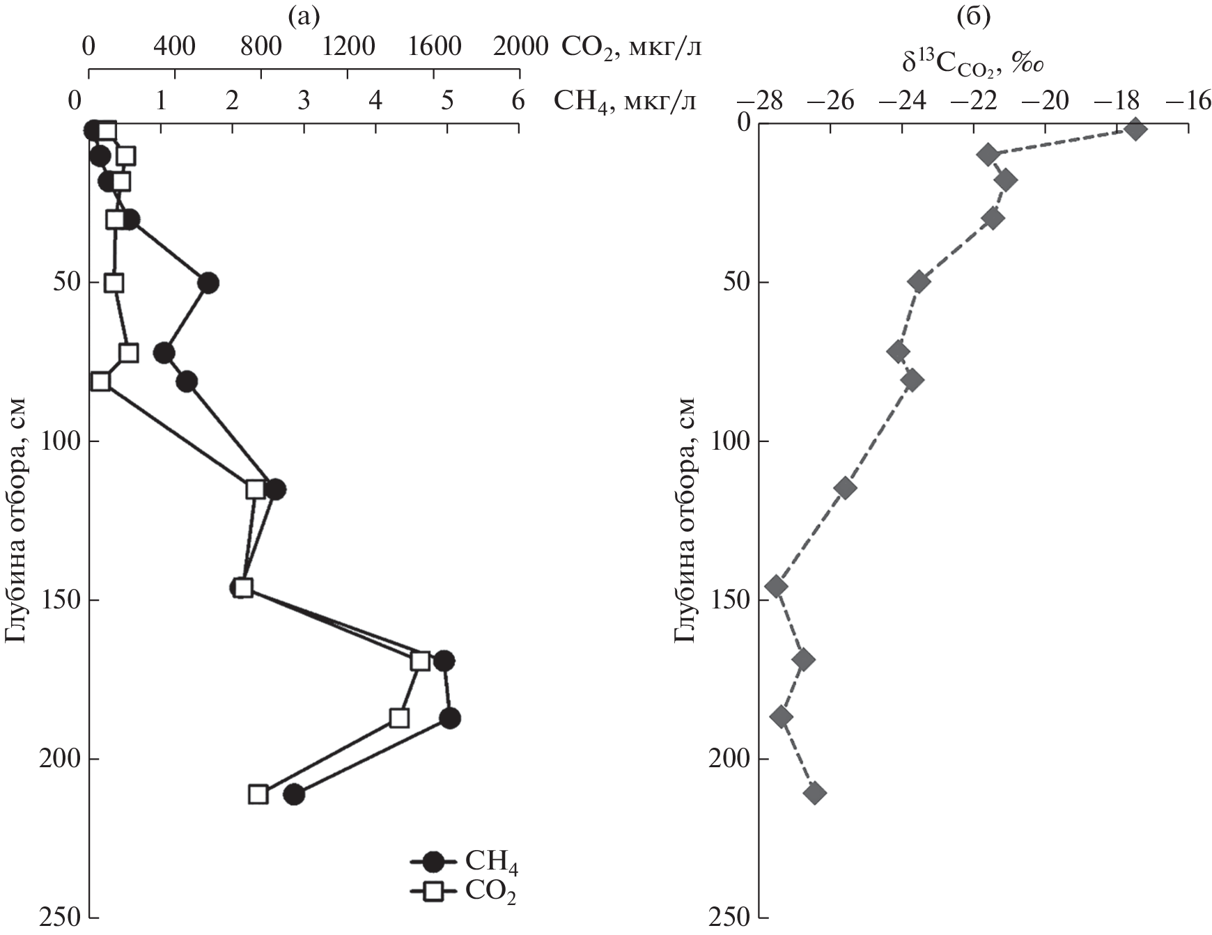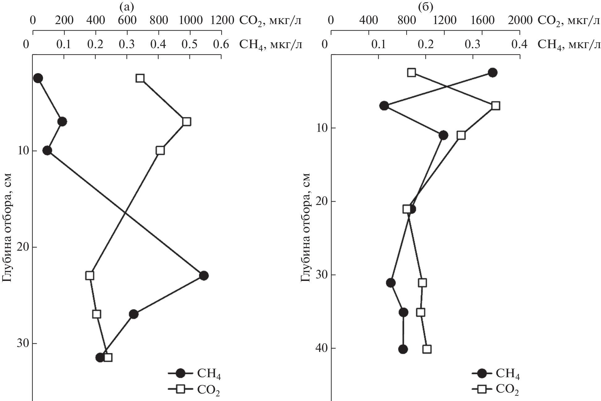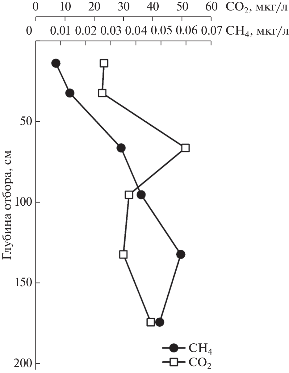 The distribution of the concentrations of CH4 and CO2 and other gases in the sediments of the Kara, Laptev and East Siberian seas was studied. A correlation was found between CH4 and CO2 in most sediment cores. The correlation coefficient R for the sediments of the Kara Sea ranges from 0.58 to 0.97 and does not depend on the gas distribution with depth. Methanogenesis in marine sediments is presumably associated with sulfate reduction, and hydrogenotrophic methanogenesis leads to an increase in CH4 concentration against the background of high CO2 concentration. The high concentration of dimethyl sulfide in the sediments indicates the simultaneous formation of CH4 and CO2 through methylotrophic methanogenesis with the participation of CH3SCH3. In the upper layers of the sediment, opposite trends in the CH4 and CO2 distribution can be observed. The fact that the correlation coefficients between CH4 and CO2 gases in the sediments of the Laptev Sea acquire both negative and positive values is probably related to the fact that gas formation processes in the upper layers of the sediment captured by short columns differ from those of deep layers.