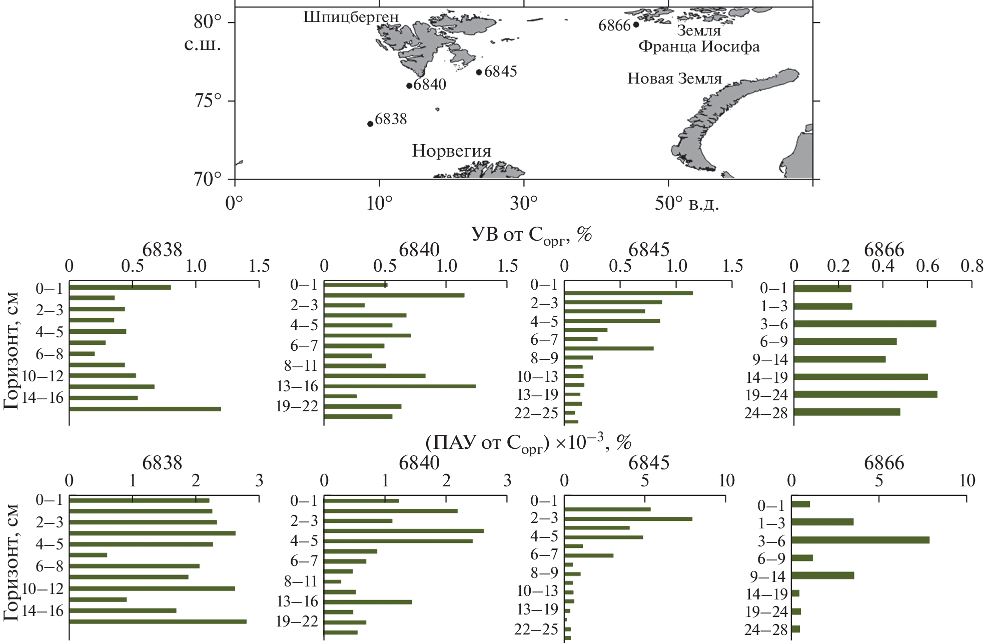 The distribution of hydrocarbons (HCs): aliphatic–AHCs and polycyclic aromatic hydrocarbons–PAHs is examined in waters and bottom sediments sampled during cruises 75 and 80 of the R/V Akademik Mstislav Keldysh in 2019 and 2020 in the Norwegian–Barents Sea Basin: Mohns Ridge, shelf of the Svalbard Archipelago, Storfjord, Medvezhinsky trench, central part of the Barents Sea, Novaya Zemlya shelf, and Franz Victoria Trough. An increase in AHCs content, on average, up to 20–23 μg/L in the suspended particulate matter (SPM) in surface waters compared to those of 2016–2017 is caused by phytoplankton bloom near the ice edge. In bottom sediments, the distribution of AHCs (3–186 μg/g) and PAHs (3–9934 ng/g) depends not only on the sedimentation conditions and particle size composition of sediments, but also on the variability of redox conditions in the sedimentary sequence and molecular diffusion of HCs from productive horizons.